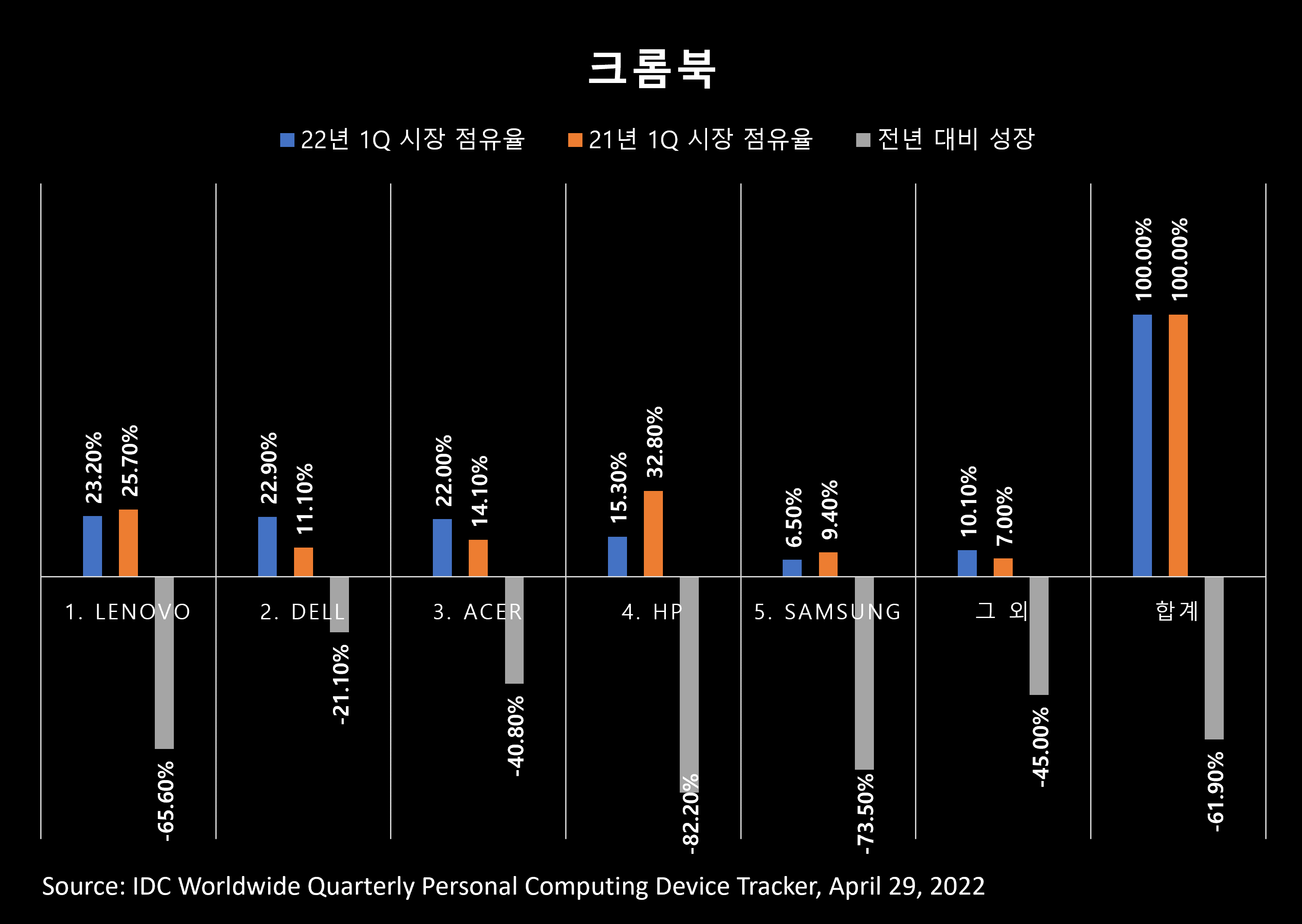 2022년 1분기 세계 크롬북 판매량은 490만대로 2021년 1분기보다 60% 줄었습니다.