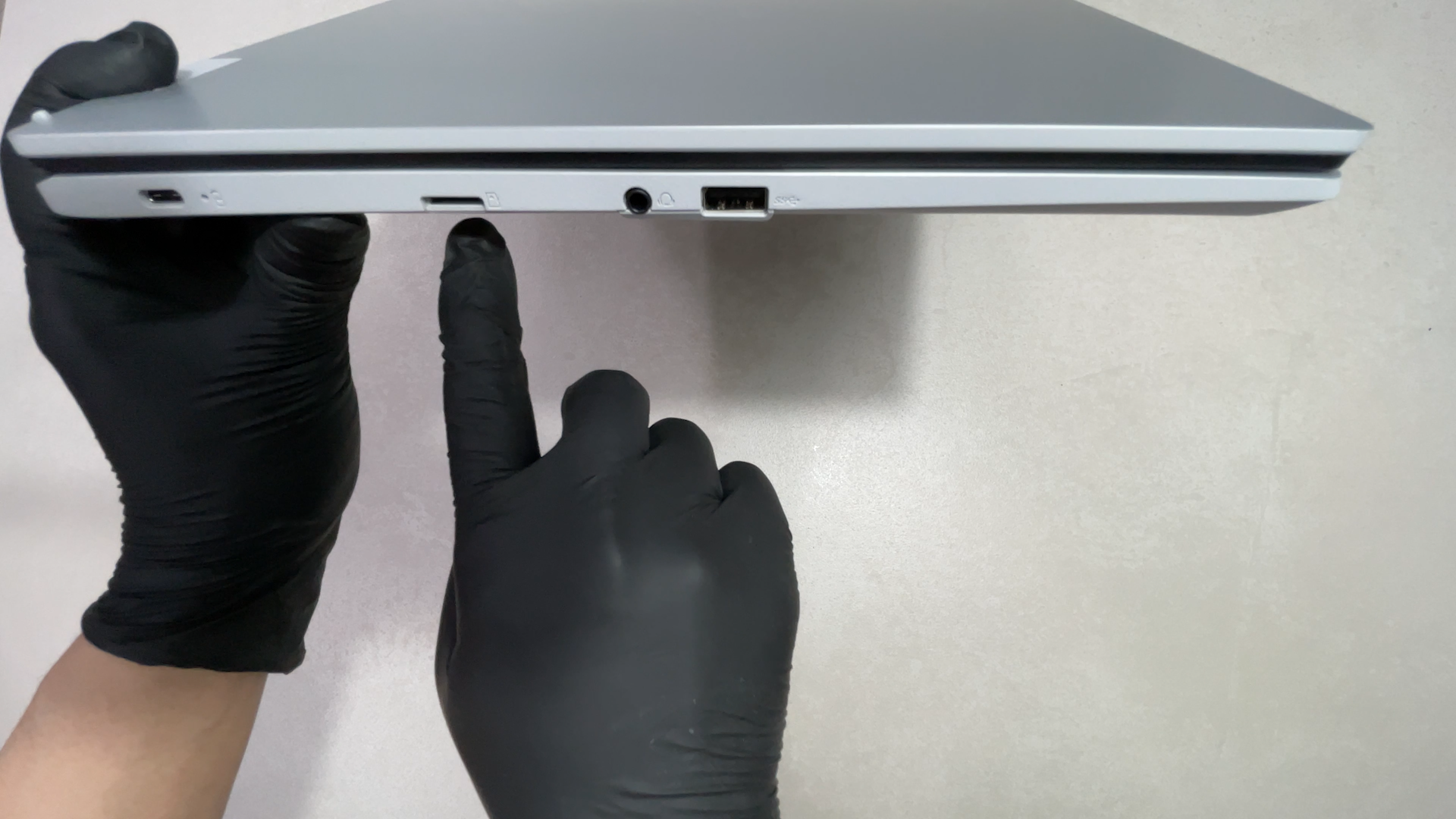 왼쪽에는 USB-C 충전 포트, microSD 카드, 이어폰 잭, USB-A 포트가 있습니다.