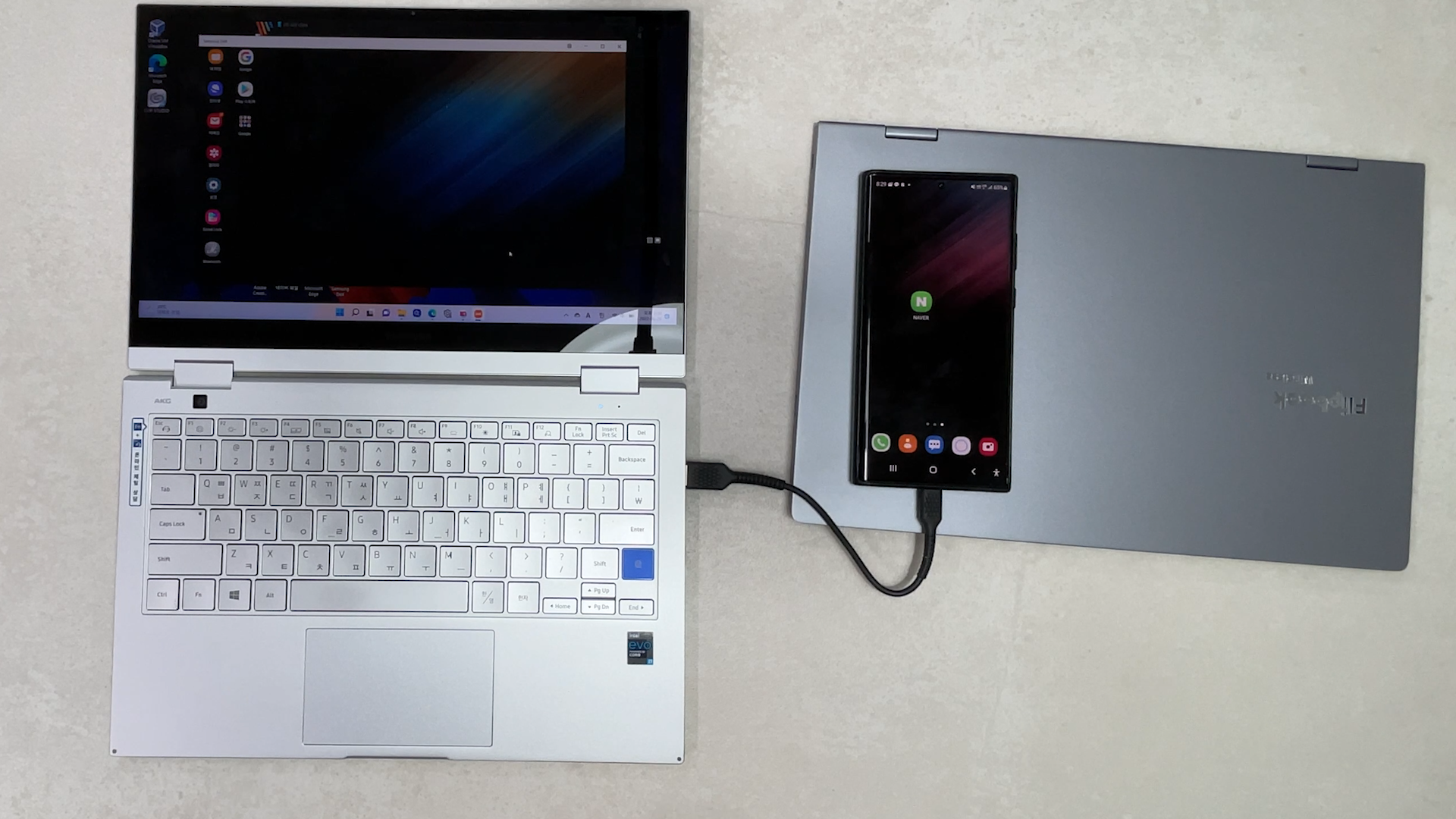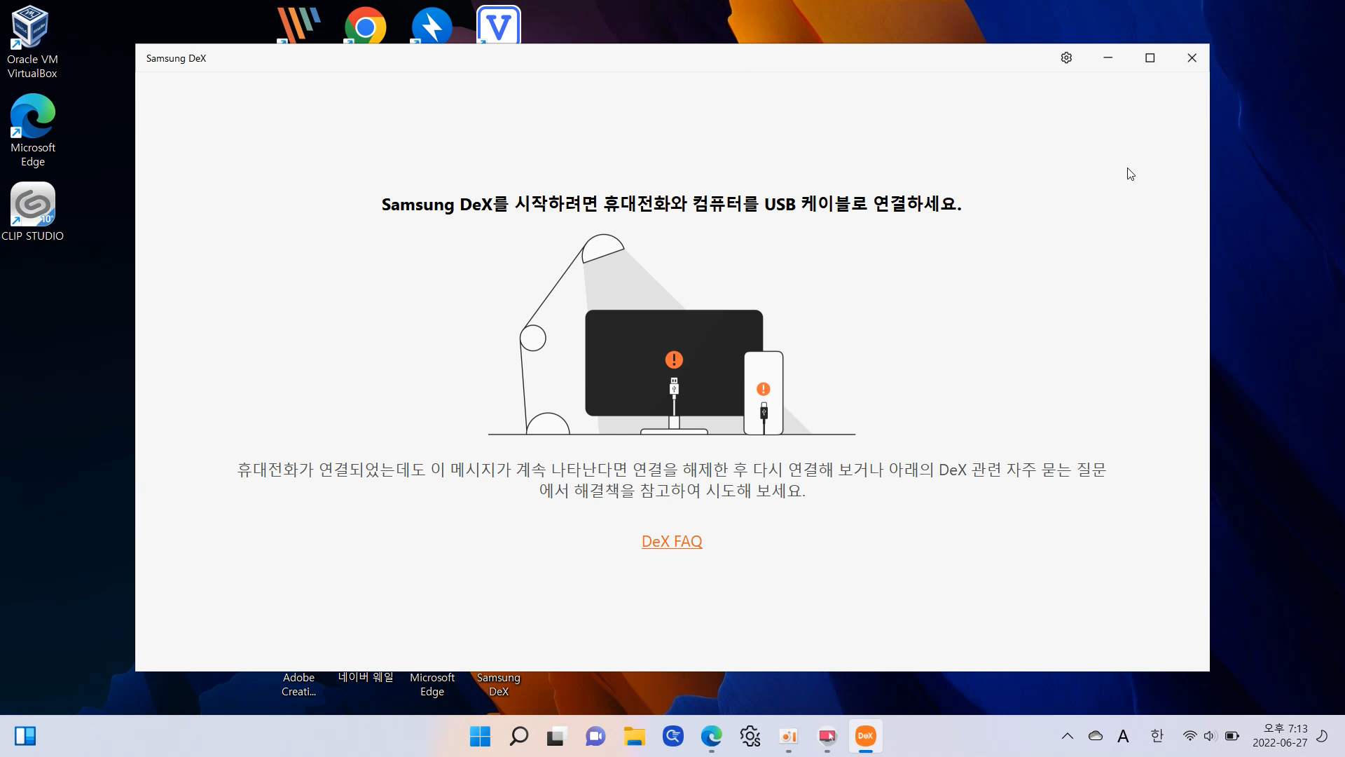 스마트폰과 노트북을 USB 케이블로 연결하면 덱스를 사용할 수 있습니다.