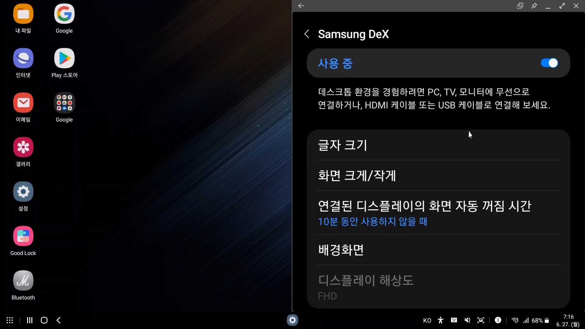 이 상태에서 휴대폰 덱스에서 "TV나 모니터에서 DeX 사용"은 덱스북이나 TV 연결할때 사용하는 거고요
