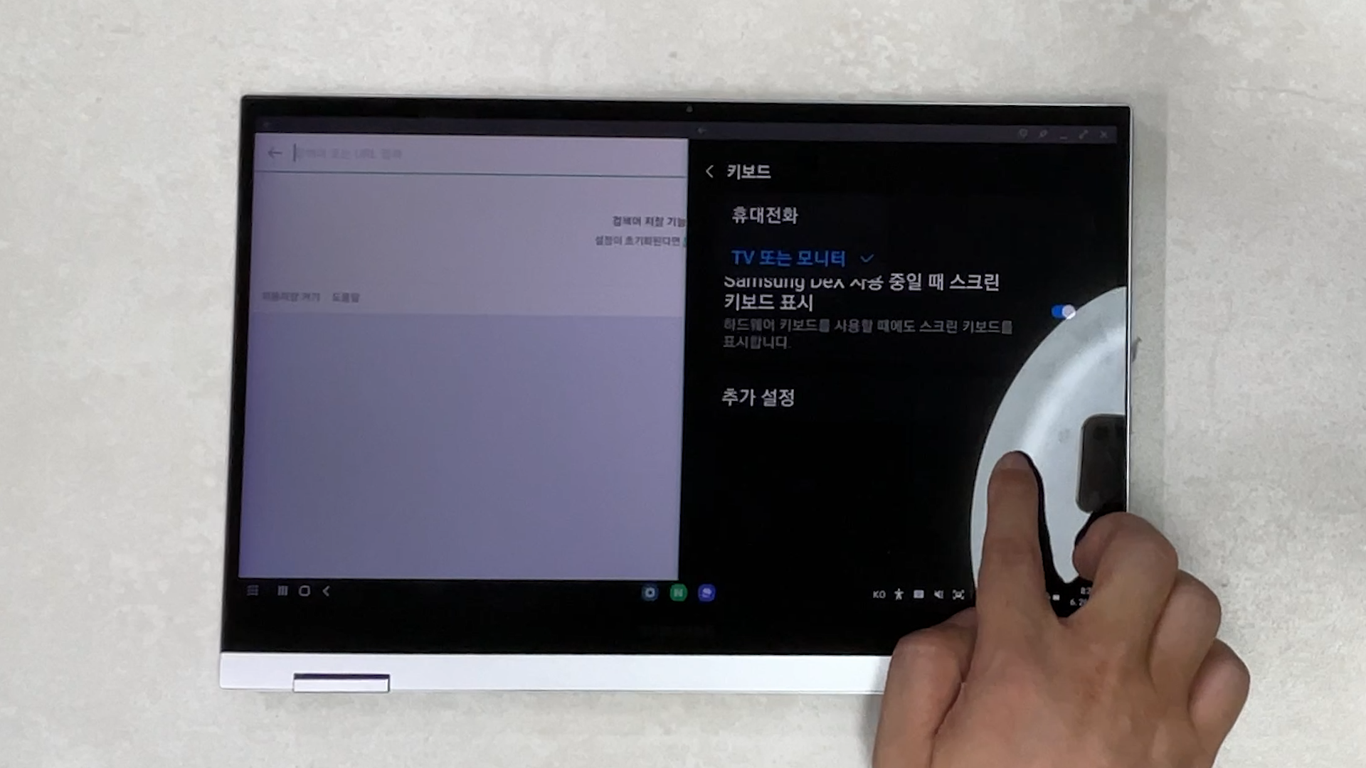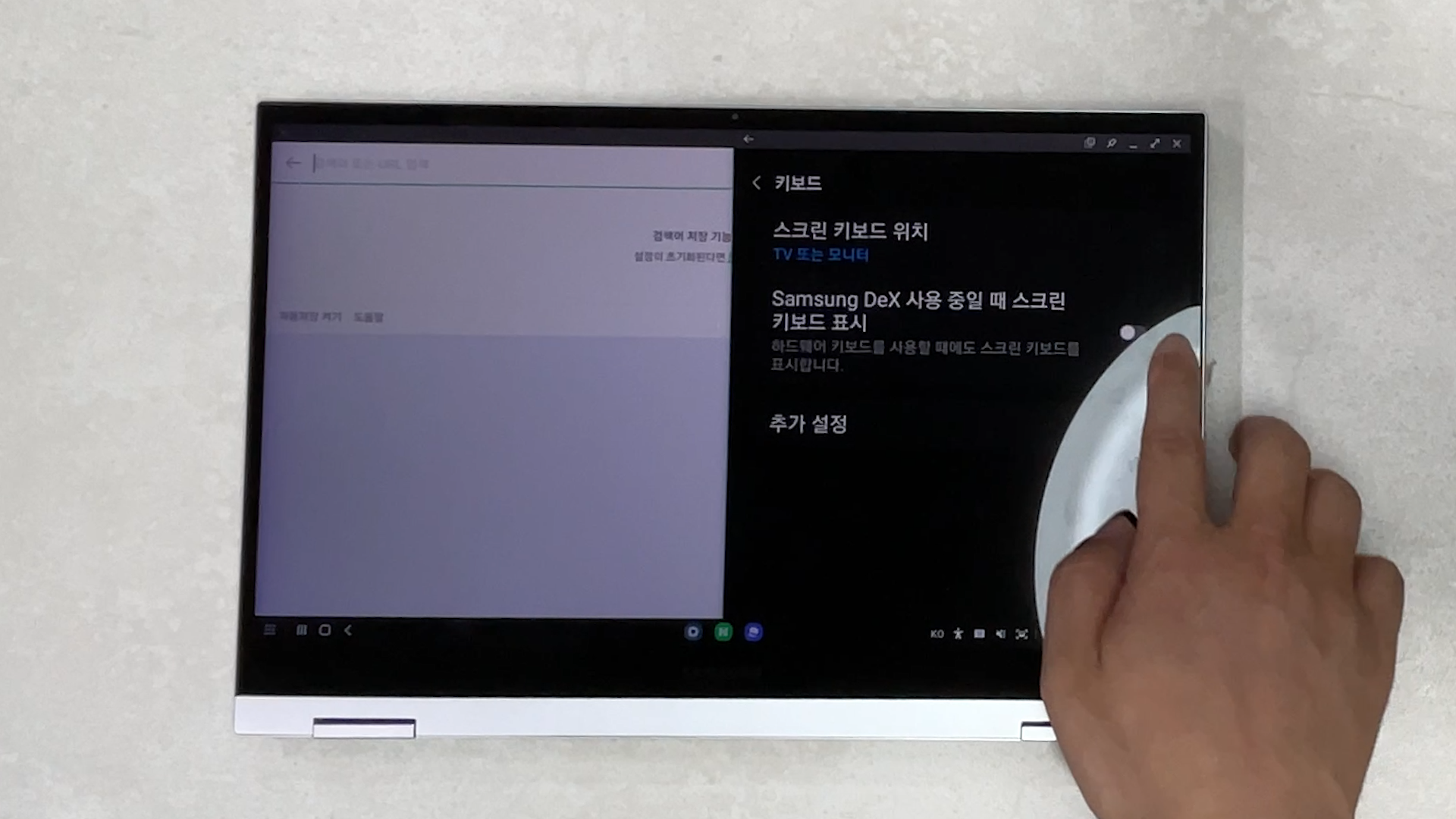 "설정 → Samsung DeX → 키보드 → Samsung DeX 사용 중일 때 스크린 키보드 표시"