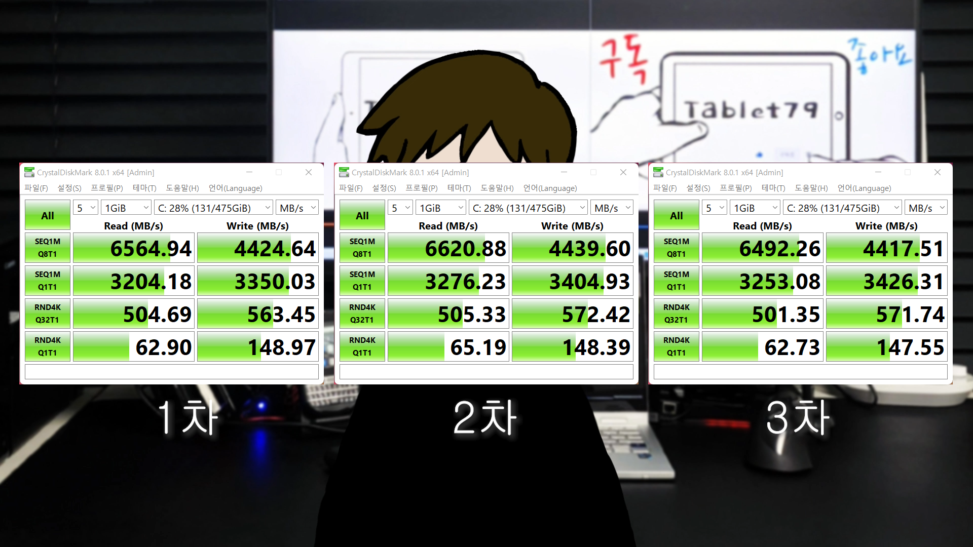 하드 디스크는 512GB SSD 제품입니다. SSD는 평균 읽기 6559점, 쓰기 4427점입니다.