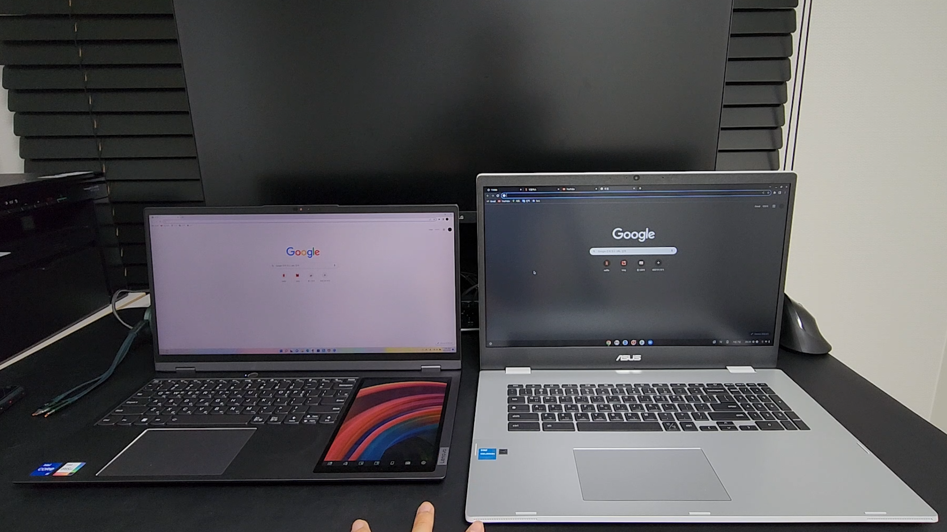 오른쪽은 얼마 전에 리뷰했던 ASUS 17.3인치(CXB170CK) 구글 크롬북이기 때문에 윈도우 노트북은 아니지만 이 화면 크기가 16:10 비율의 노트북이면 이 정도 크기라고 보면 될 거 같습니다.