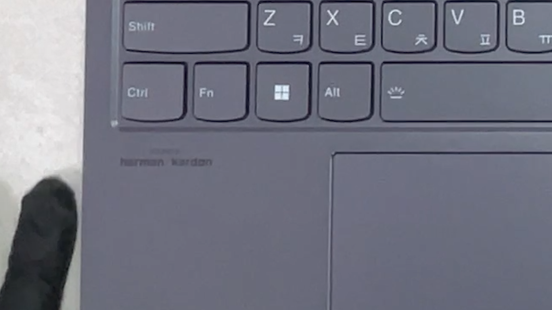노트북 하판은 스피커가 길게 상단을 차지하고 있습니다. 2W Harman Kardon 스테레오 스피커에 Dolby Atmos 스피커 시스템을 갖추고 있습니다.