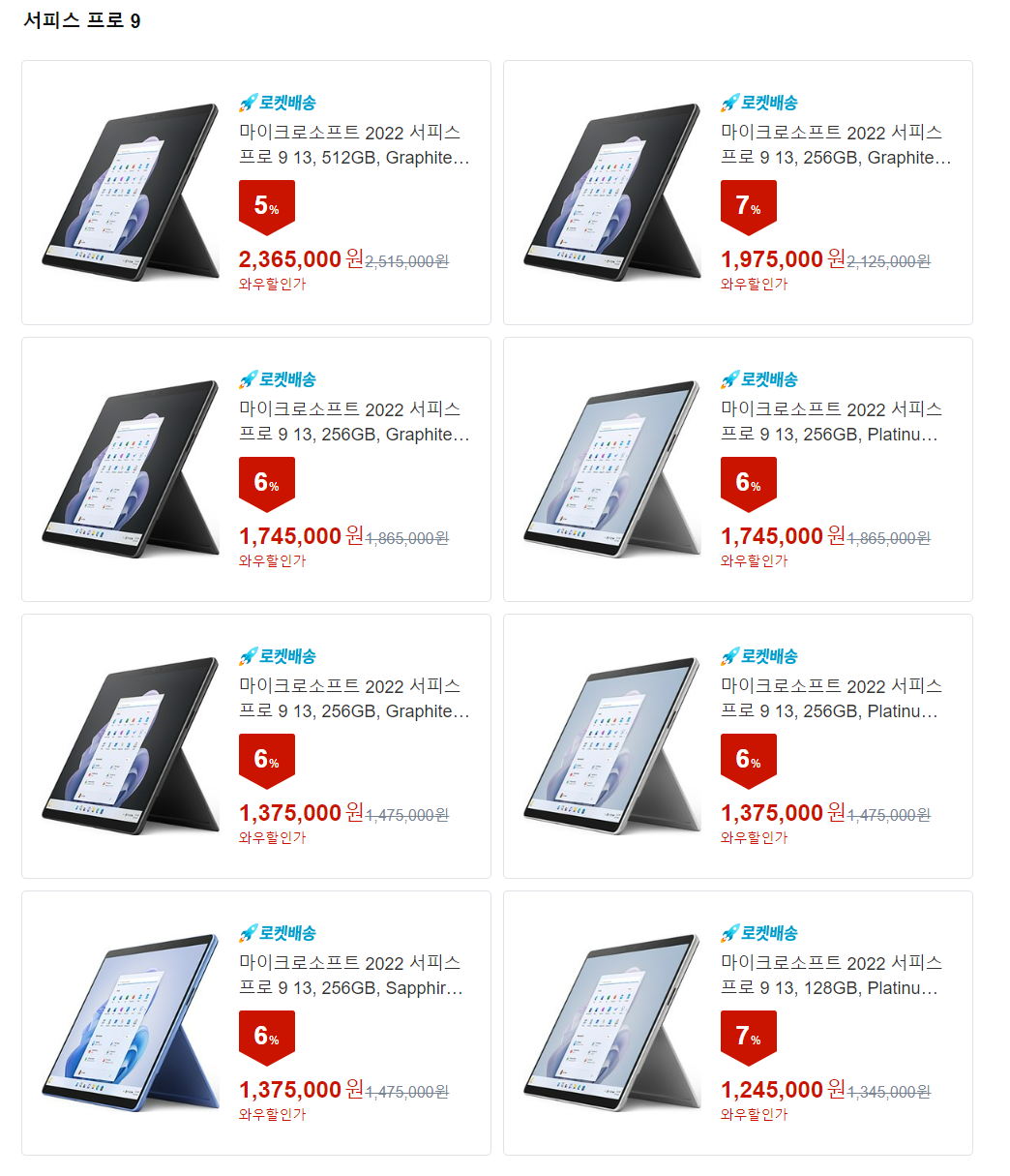 색상은 네이버와 동일하게 서피스 프로9 i7 16GB 256GB, 512GB 모델은 그래파이트 색상만 판매하고 플래티넘 색상은 없습니다. 그리고 i7 16GB 1TB 모델과 i5 8GB 256GB 포레스트 모델 색상도 없습니다.