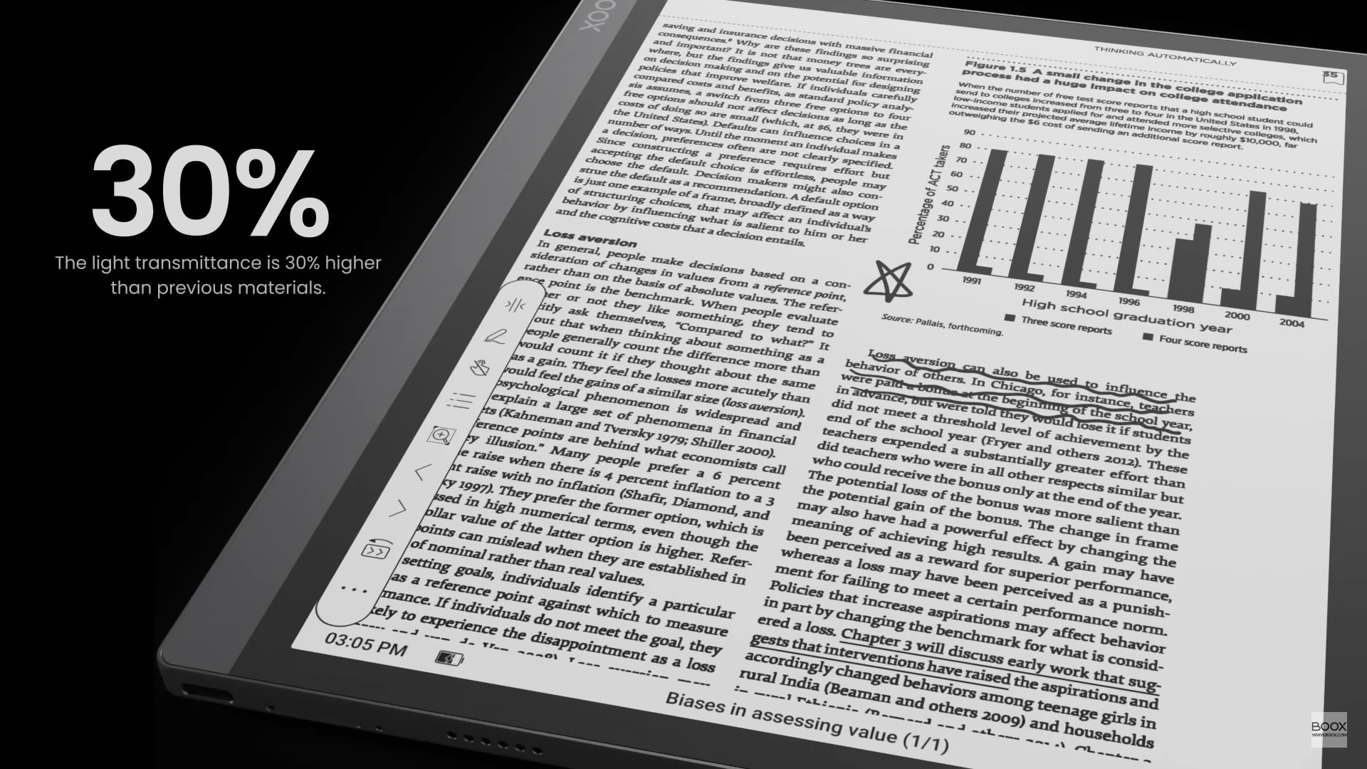 eink 화면의 빛 투과율은 30% 높여서 가독성을 올렸습니다.