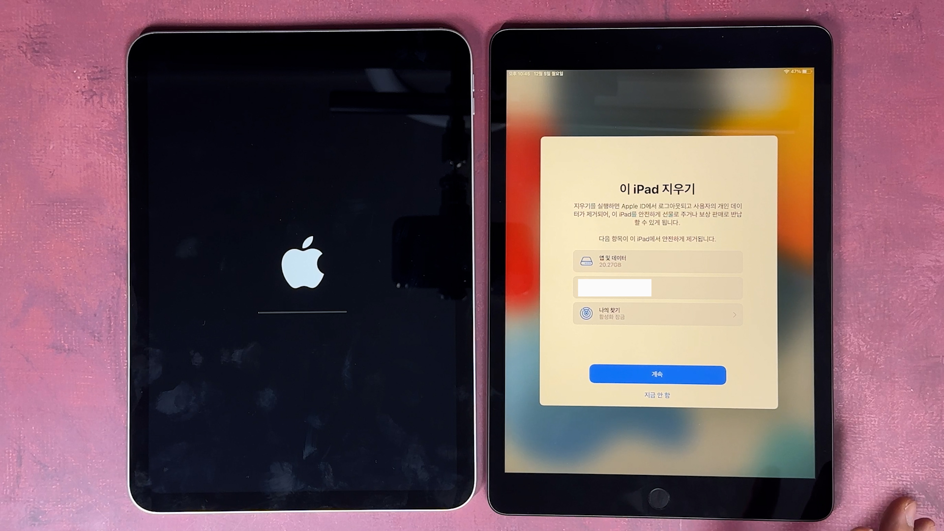 이 iPad를 지울 거냐 물으면, 지금 초기화 하고 판매할 생각이 있으면 '계속'을 선택하고, 같이 사용한다면 '지금 안 함'을 선택합니다.