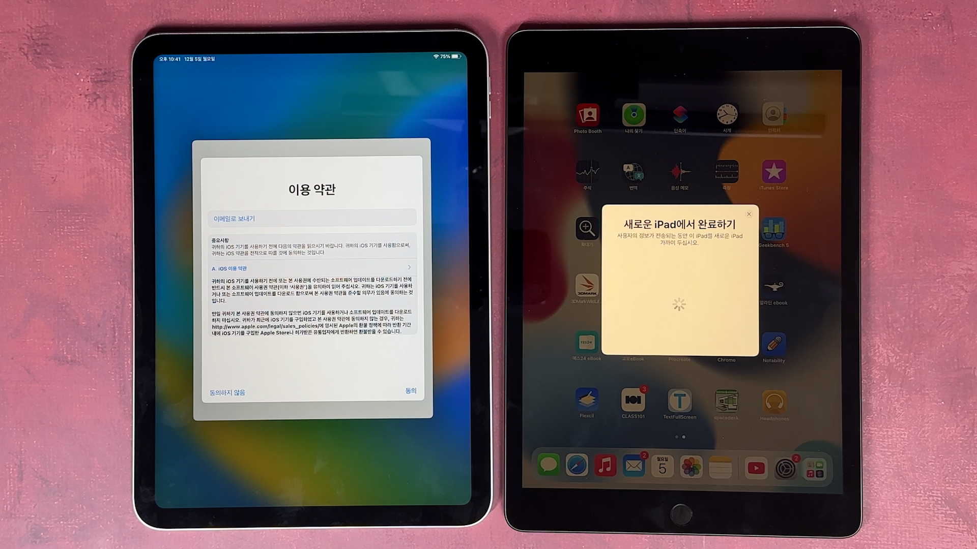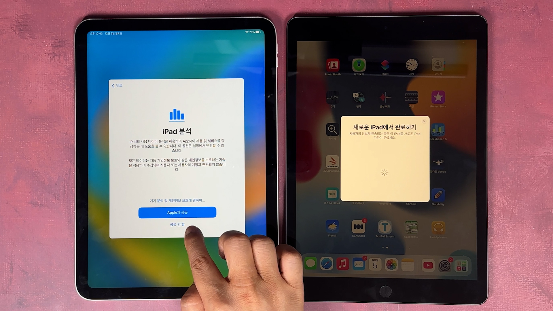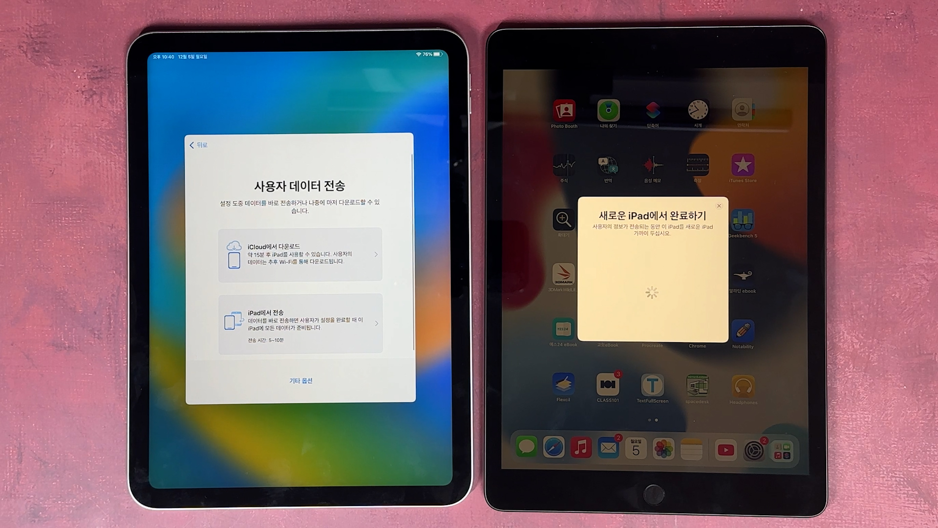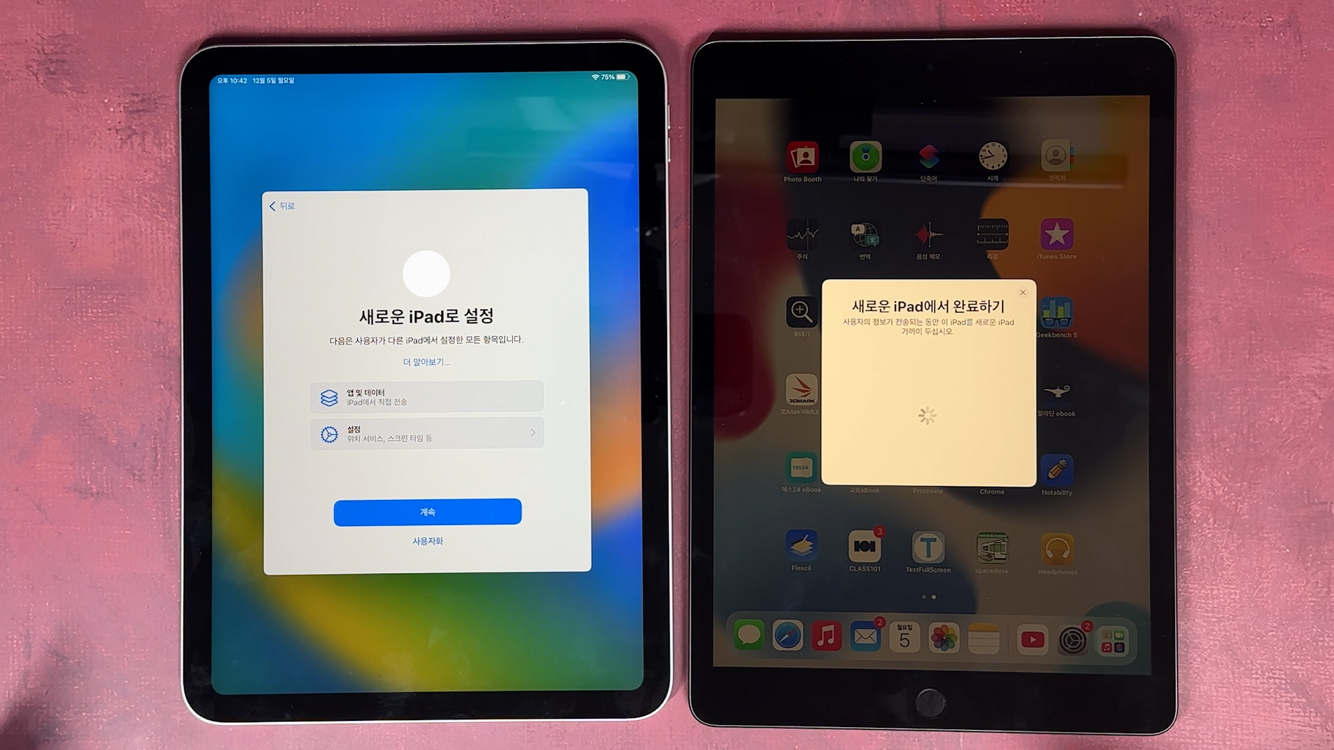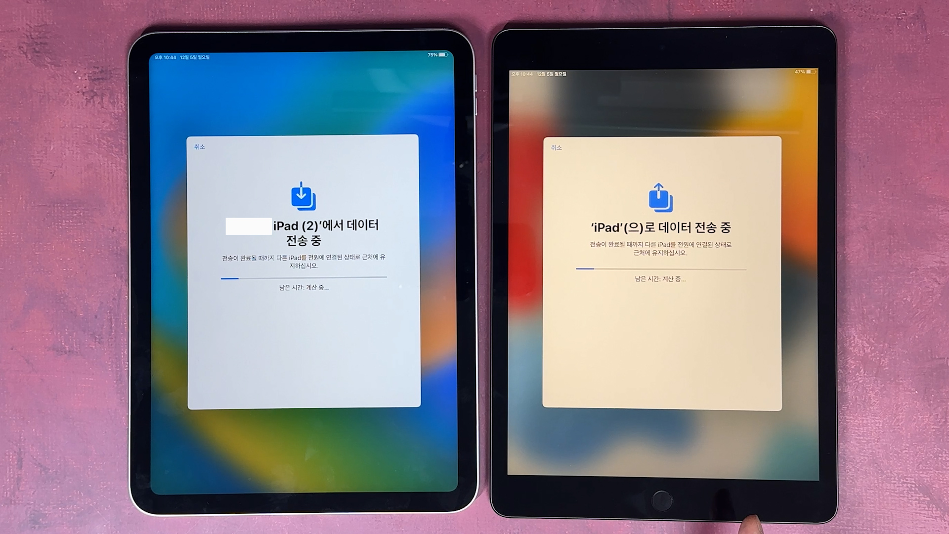 iPad로 데이터 전송 나오고 그 다음에 기존에 있던 iPad에 있는 데이터를 iPad 10세대로 전송이 완료되면 끝납니다.