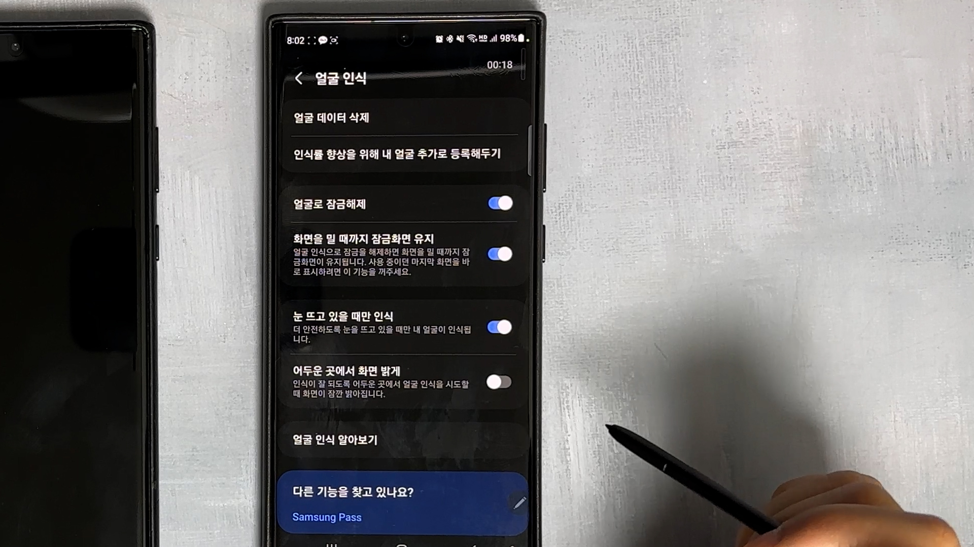 그리고 잠금 화면 설정을 얼굴 인식으로 사용하는 분들도 있잖아요 얼굴 인식에서 어두운 곳에서 화면 밝게를 꺼주고 사용해 주세요 이걸 꺼주지 않으면 어두운 환경에서 얼굴 인식을 위해서 화면이 갑자기 밝아져서 눈이 시릴 수 있어요