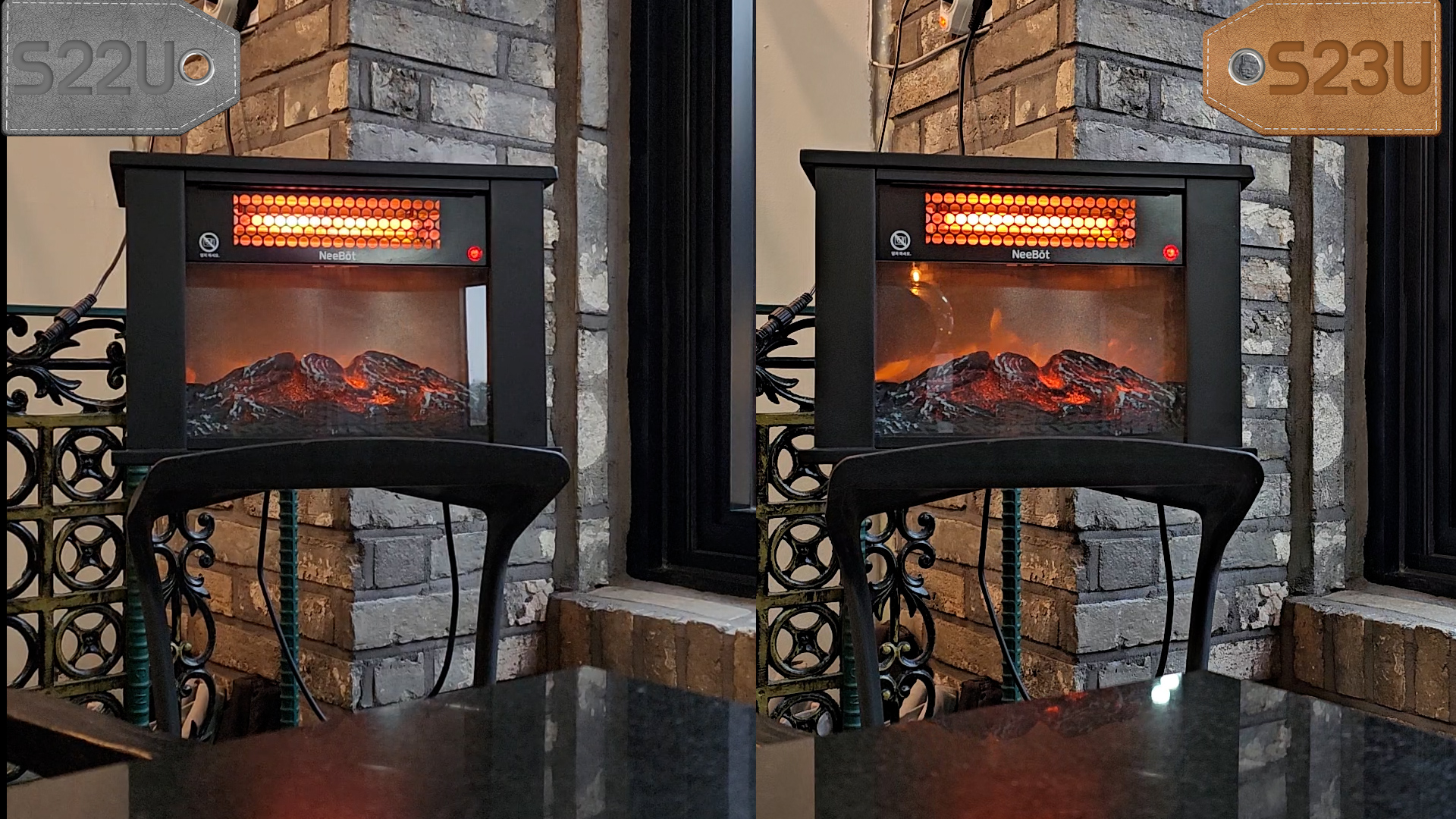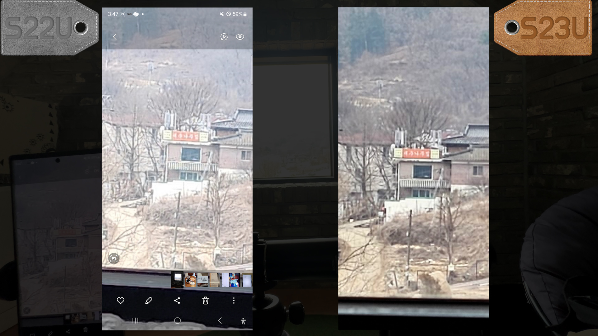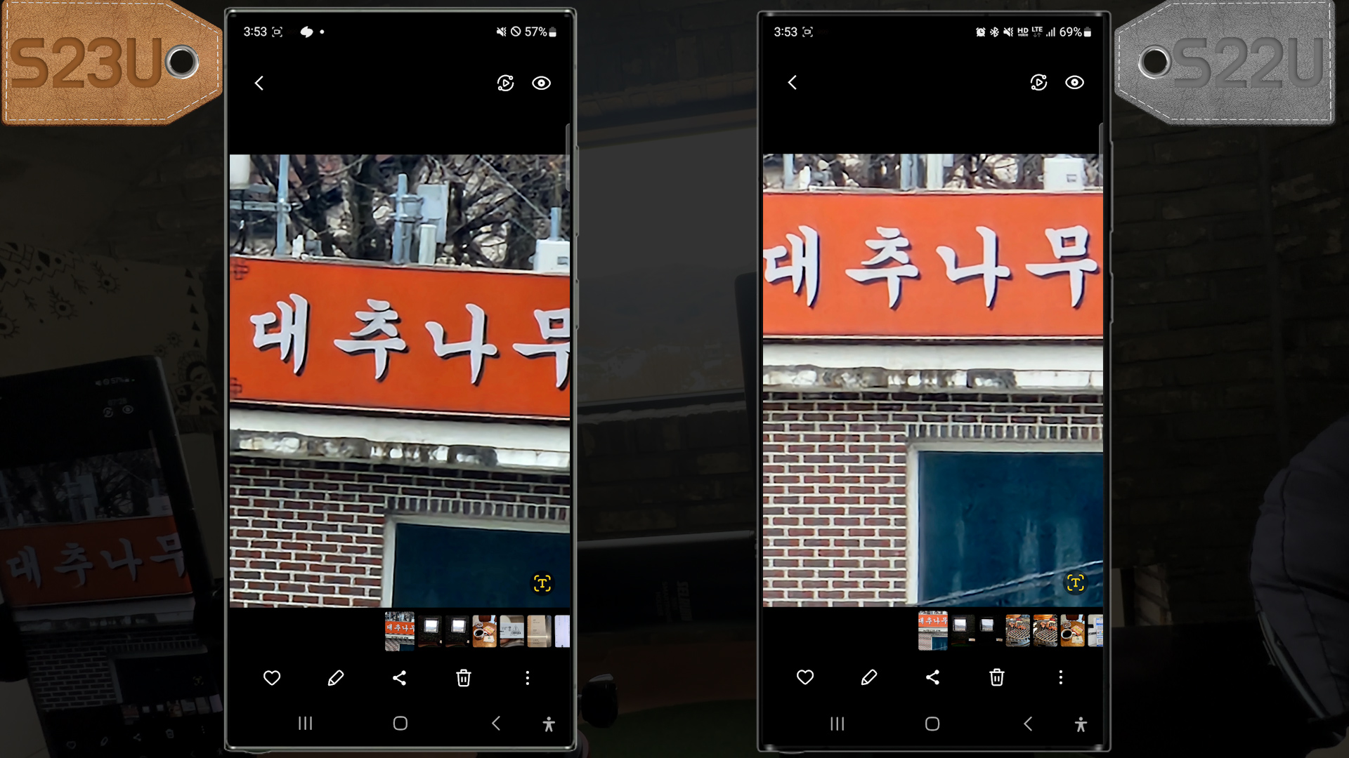 둘다 촬영하고 확대해 보니 S23U 촬영 결과물이 만족스럽지 않네요 어두운 환경에서 소프트웨어 보정 문제가 있어 보입니다.