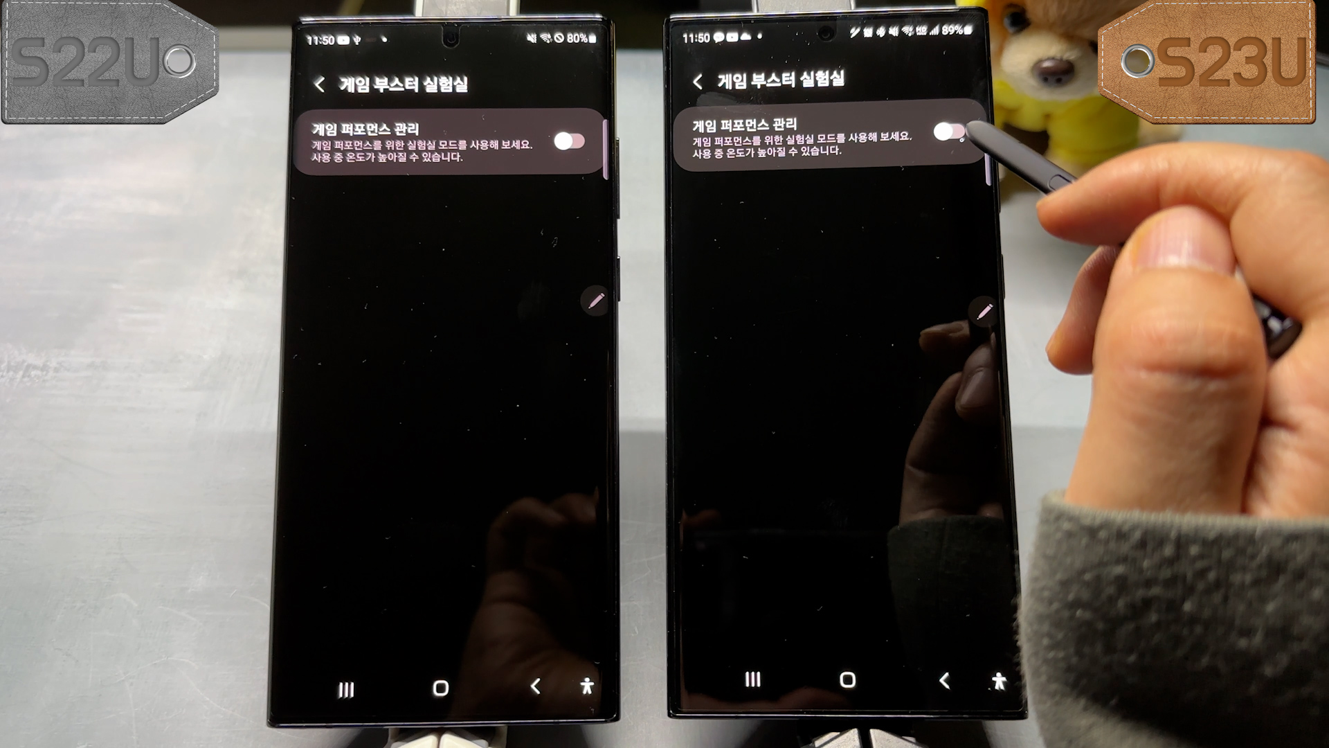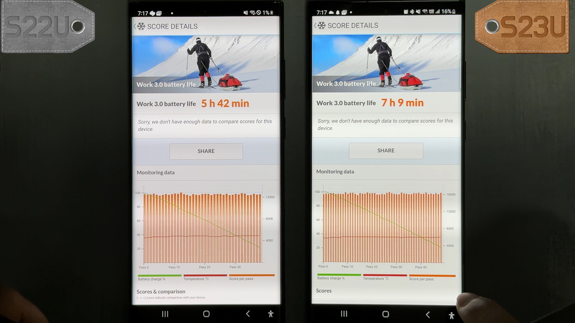 배터리 용량은 둘다 5000mAh로 동일하고 최대 밝기 기준으로 S22U는 5시간 42분, S23U는 7시간 9분 측정되었습니다.