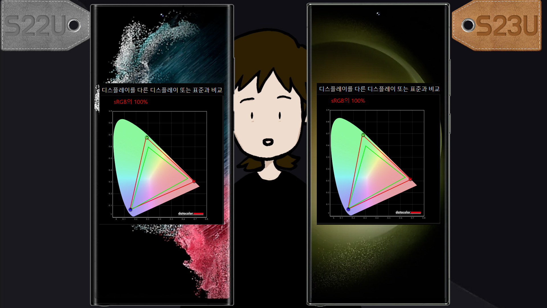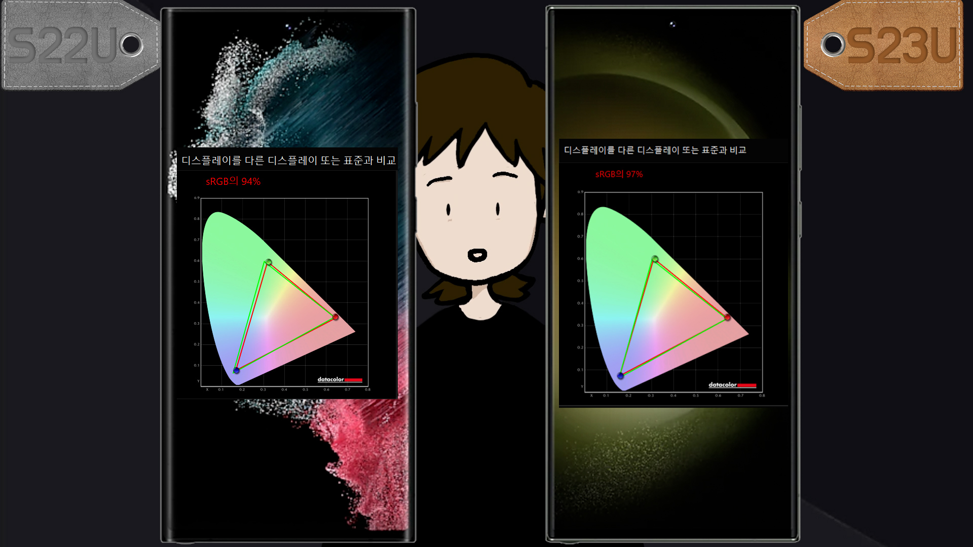 자연스러운 화면에서 S22U sRGB 94%, S23U sRGB 97% 나오고, S22U P3 71%, S23U P3 73% 나왔습니다.