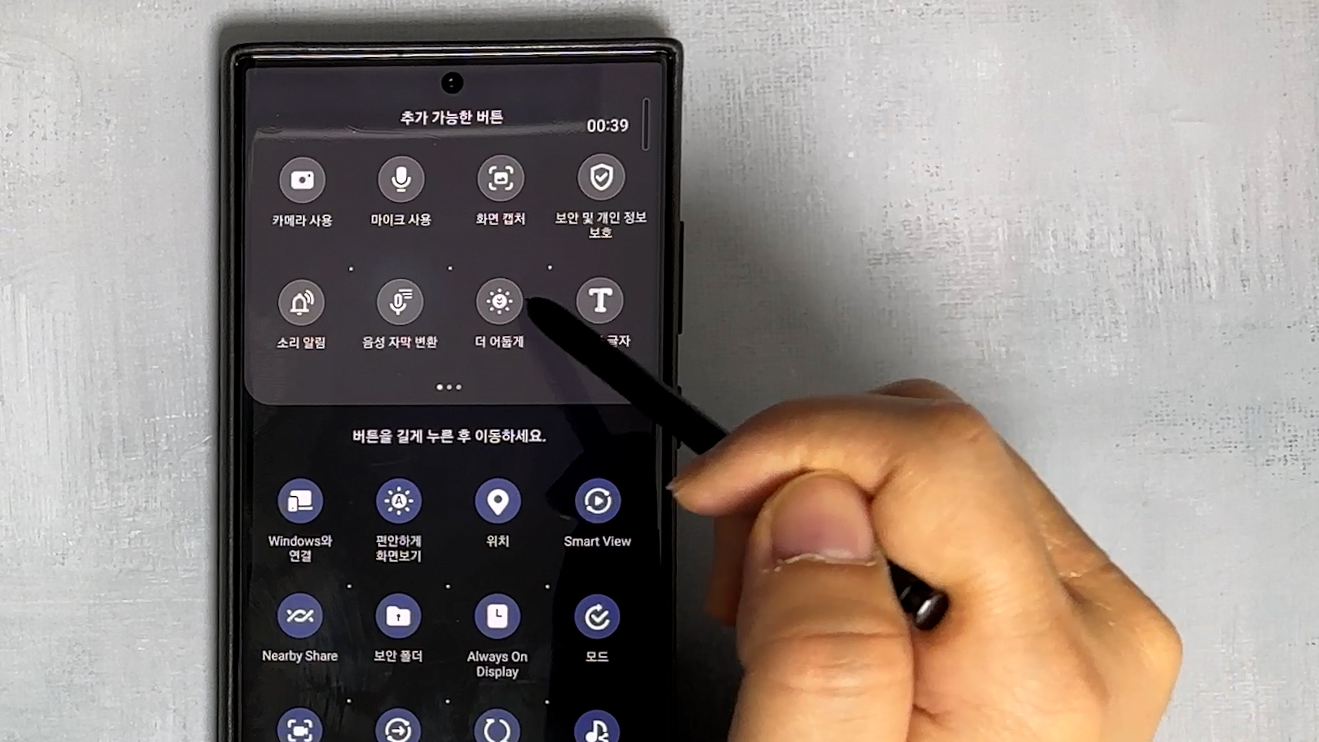 그리고 이번에 버튼 편집에 더 어둡게 기능이 생겼어요 밤에 불 끄고 스마트폰 보는 분들 많잖아요 그럴 때 사용하면 좋은 기능인데요