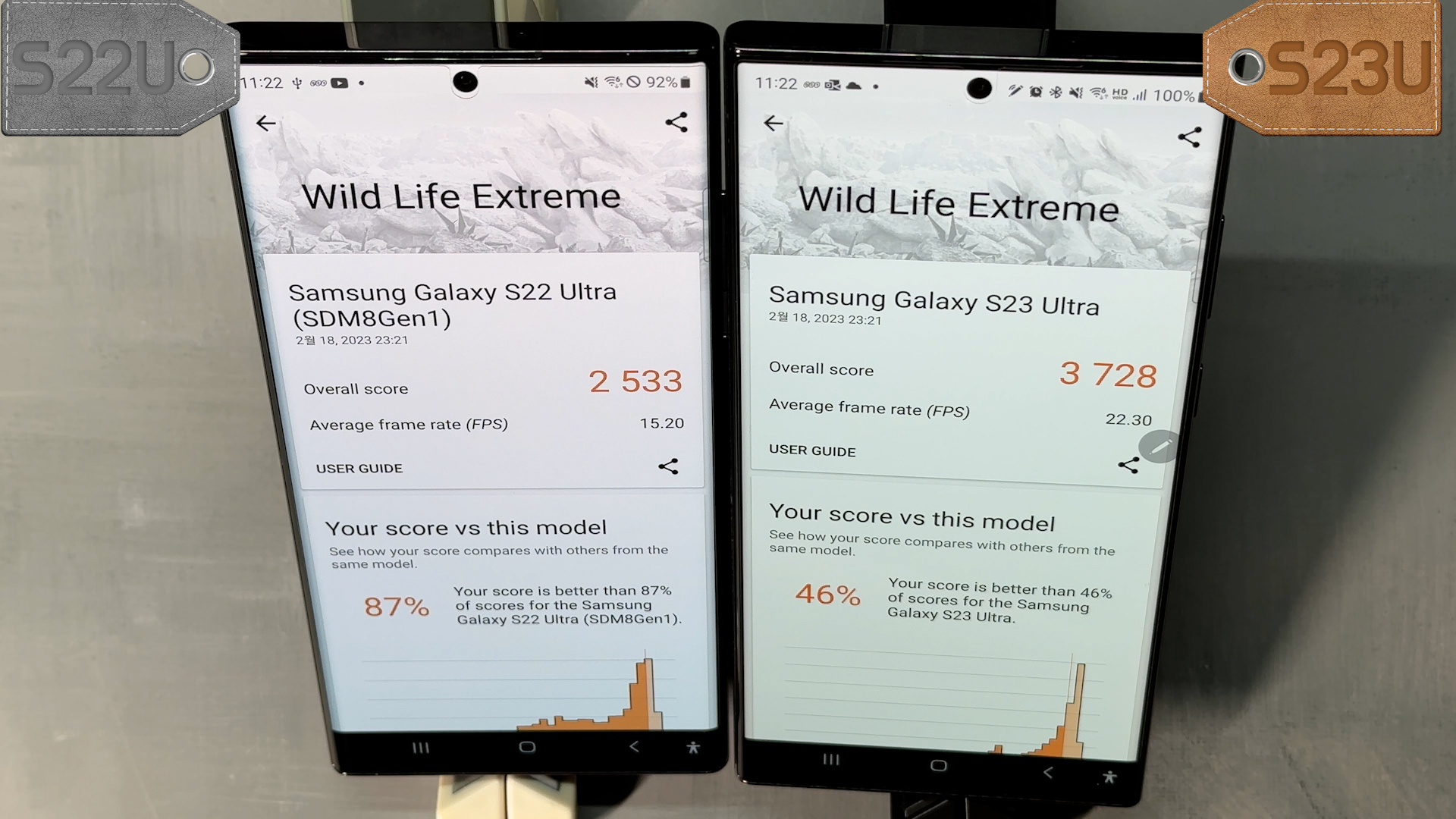 WILD LIFE EXTREME 측정은 S22U는 2533점 S23U는 3728점 나옵니다.