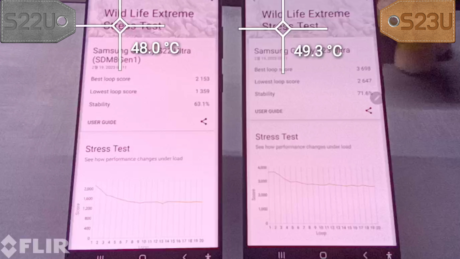 이 상태에서 3DMARK WILD LIFE EXTREME STRESS TEST를 진행하면 최대 온도는 전면 S22U 48°C, S23U 49°C 나왔고