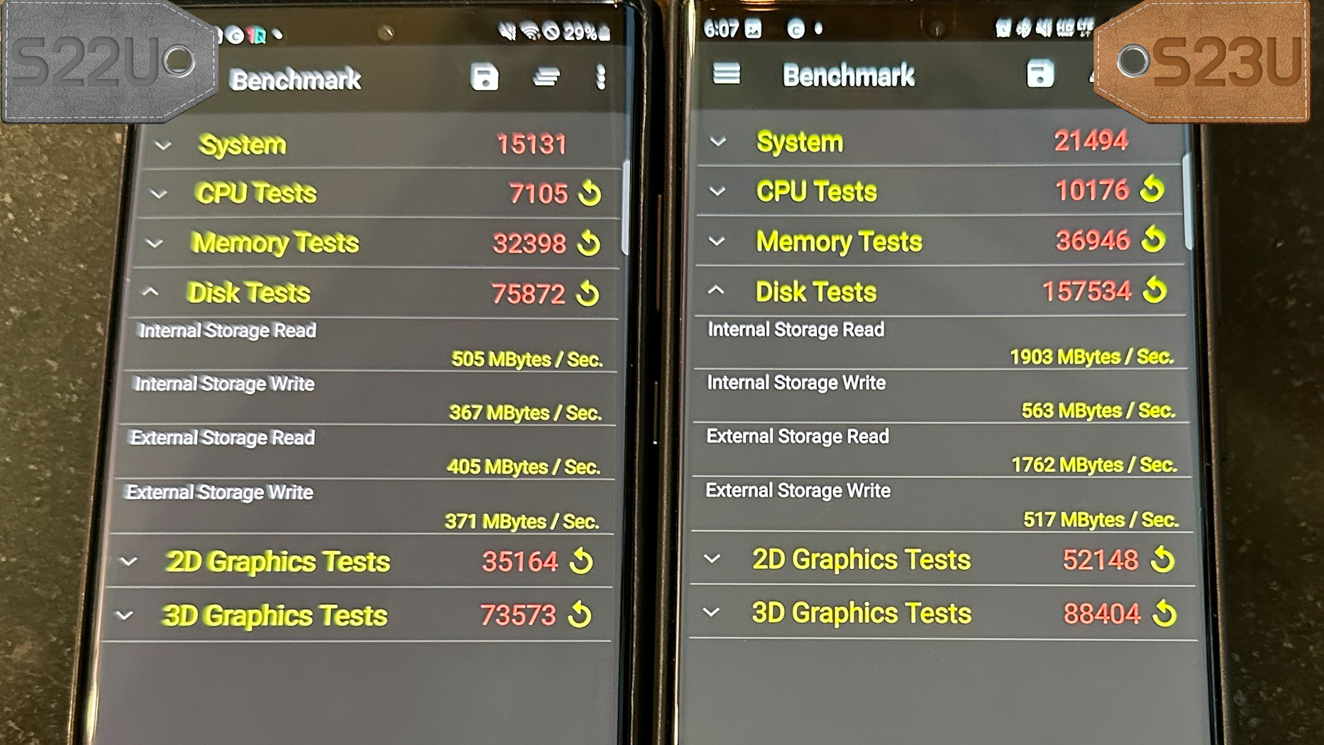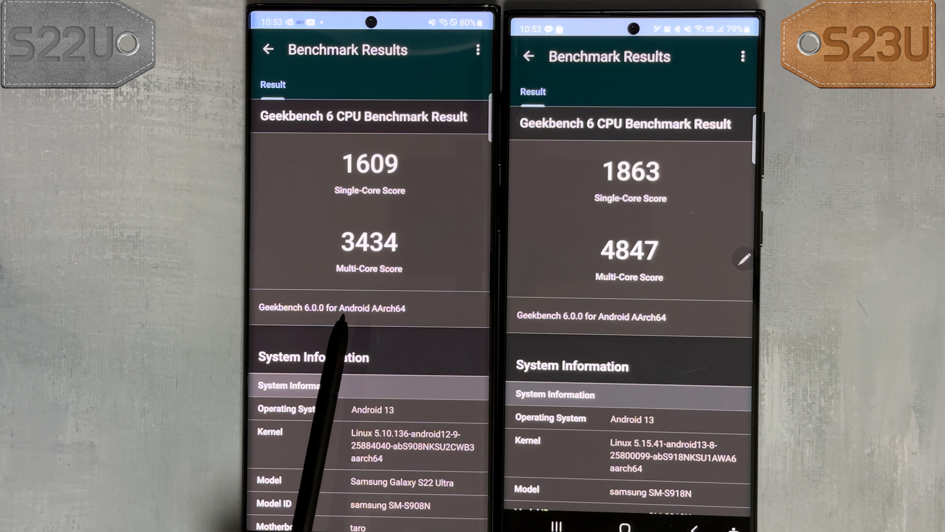 긱벤치6에서는 S22U는 싱글 1609점, 멀티 3434점, S23U는 싱글 1863점, 멀티 4847점 나옵니다.