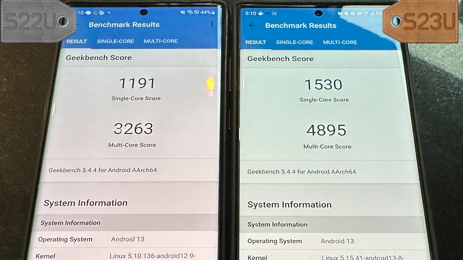 긱벤치5를 측정해 보면 S22U는 싱글 1191점, 멀티 3263점 나오고 S23U는 싱글 1530점, 멀티 4895점 나옵니다.