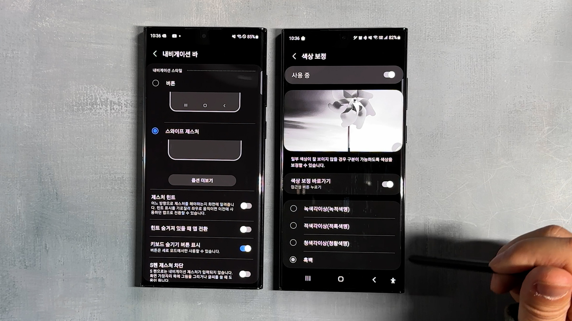 만약 흑백 모드로 변경이 안된다면, 설정 > 접근성 > 시인성 향상 > 색상 보정 여기서 흑백으로 선택이 안되어 있어서 그래요