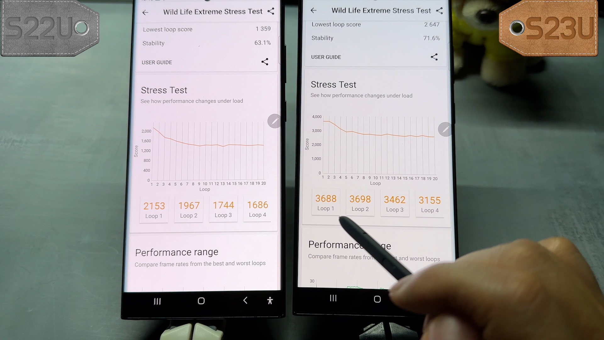 측정 결과는 S22U는 2153점~1686점까지 나왔고, S23U는 3688점~3155점까지 나옵니다.