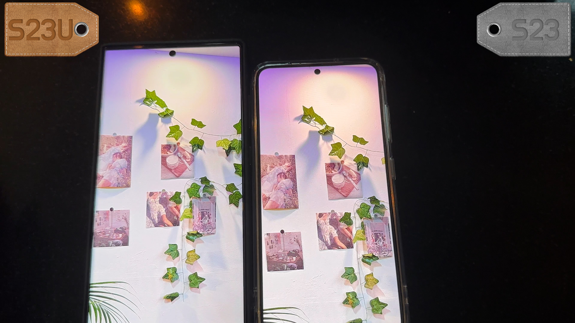 액정에서 볼 때는 S23이 더 색감이 진하게 나오네요 특히 위쪽에 보라색 조명의 차이점을 봐주세요
