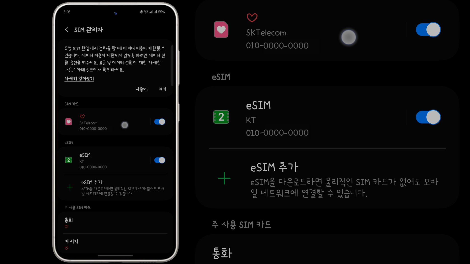 설정 - 연결에서 SIM 관리자를 보면 메인과 eSIM 2개가 보여요
