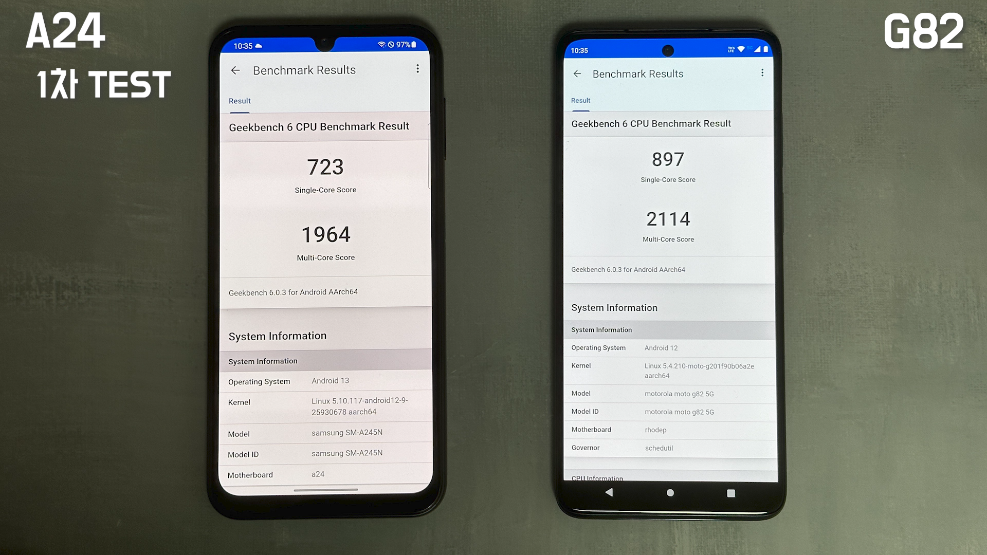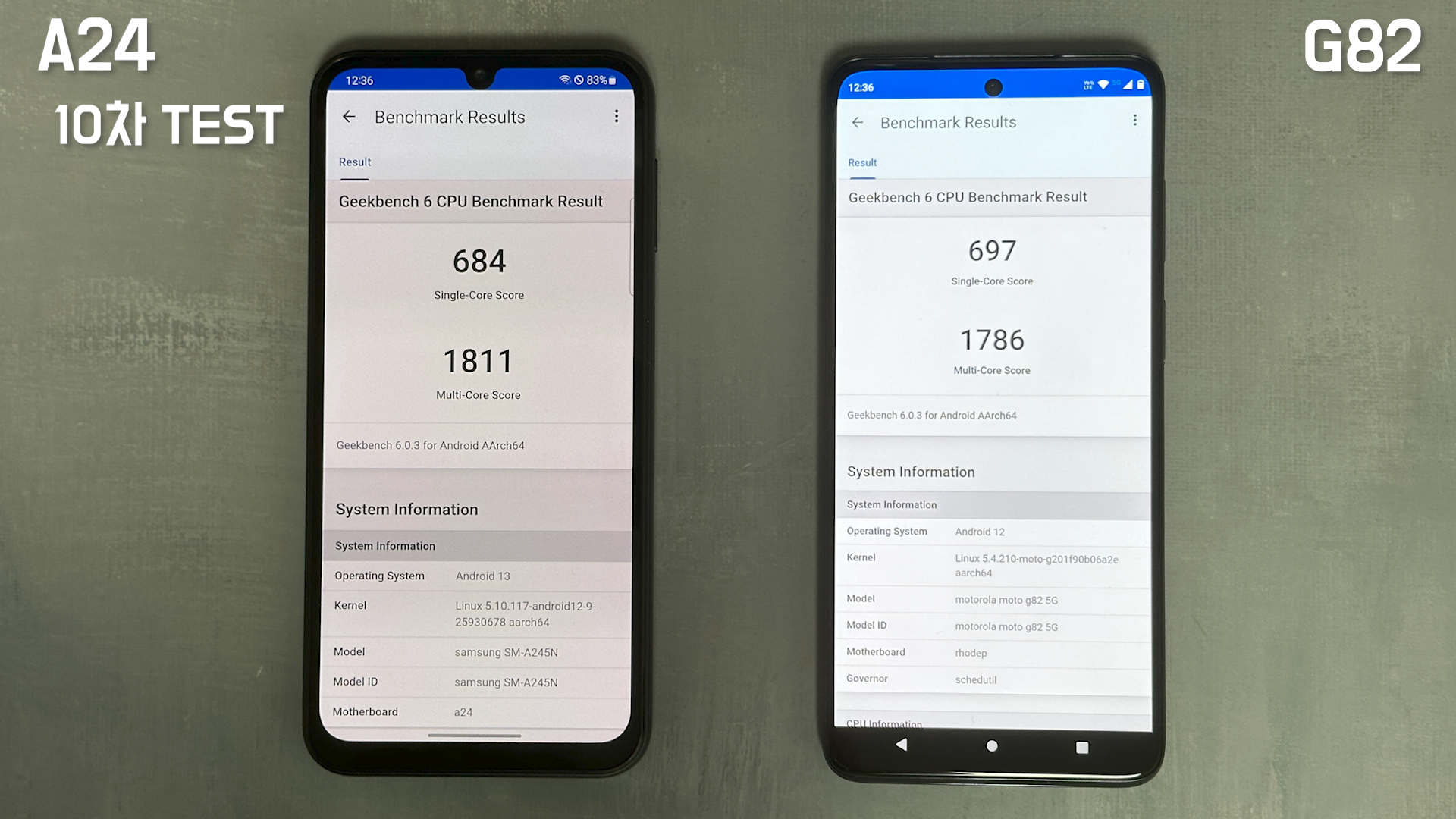 실내 온도가 29℃에서 긱벤치 6로 CPU 테스트한 결과 1차 테스트에서는 모토 G82가 더 높게 나왔습니다.