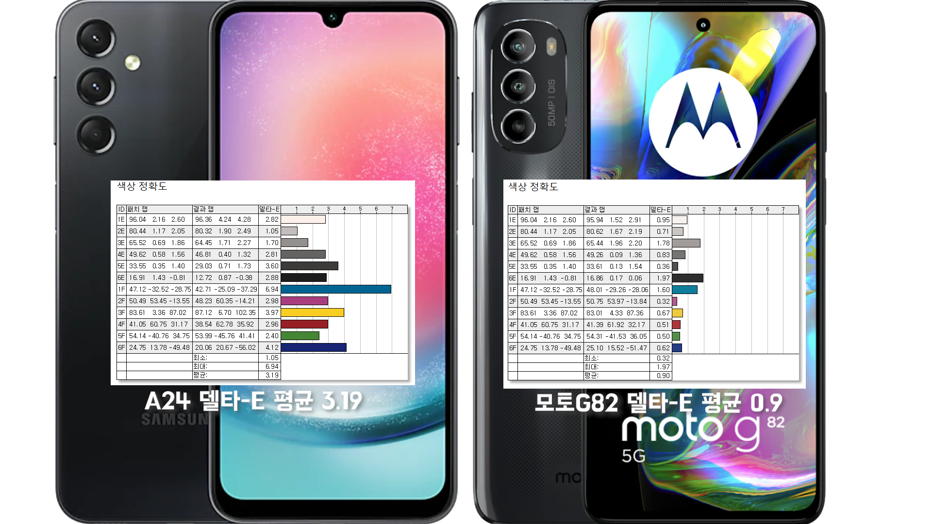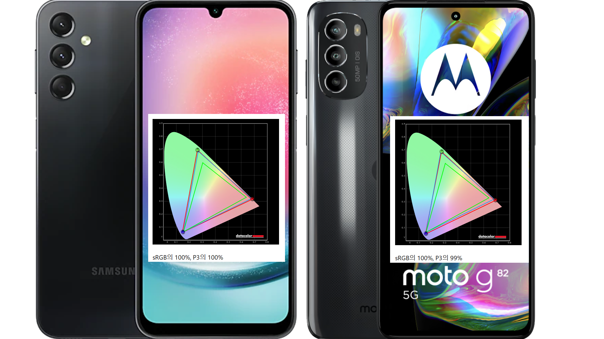 둘 다 sRGB 100%에 갤럭시 A24 P3 100%, 모토 G82 99% 큰 차이 없이 측정이 되었는데요