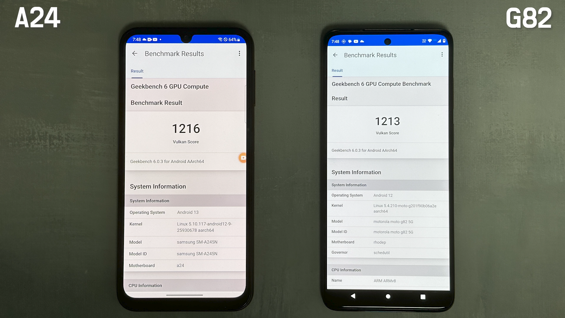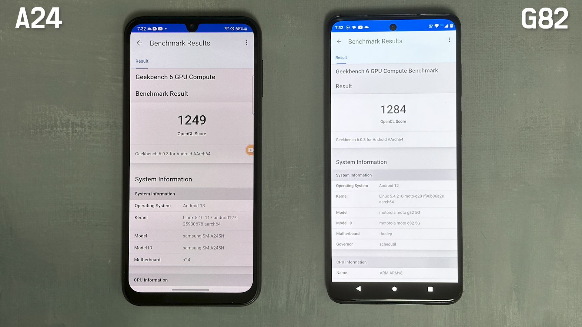 긱벤치 6로 GPU 테스트의 일종인 OpenCL 벤치마크 테스트는 모토 G82가 더 높게 나왔습니다.