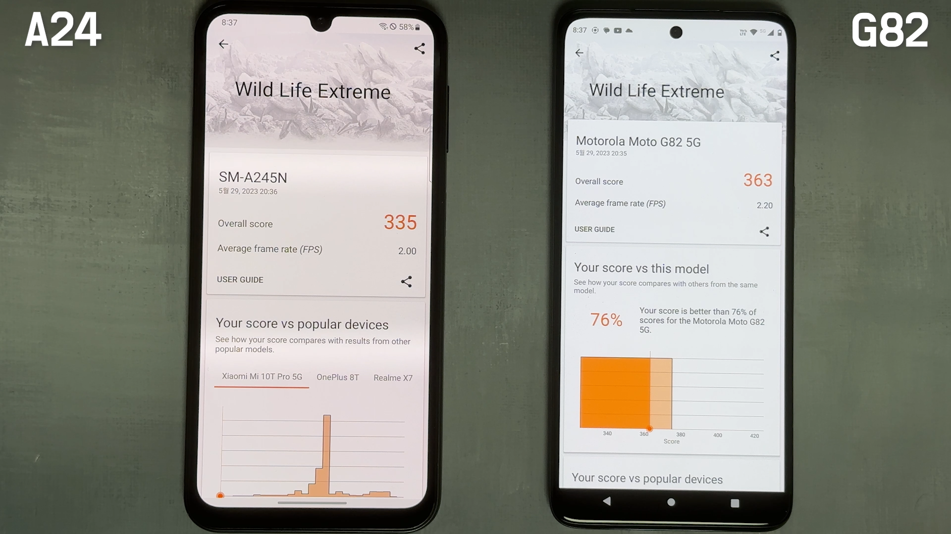 Wild Life Extreme 테스트는 갤럭시 A24는 335점, 모토 G82는 363점이 나왔습니다.