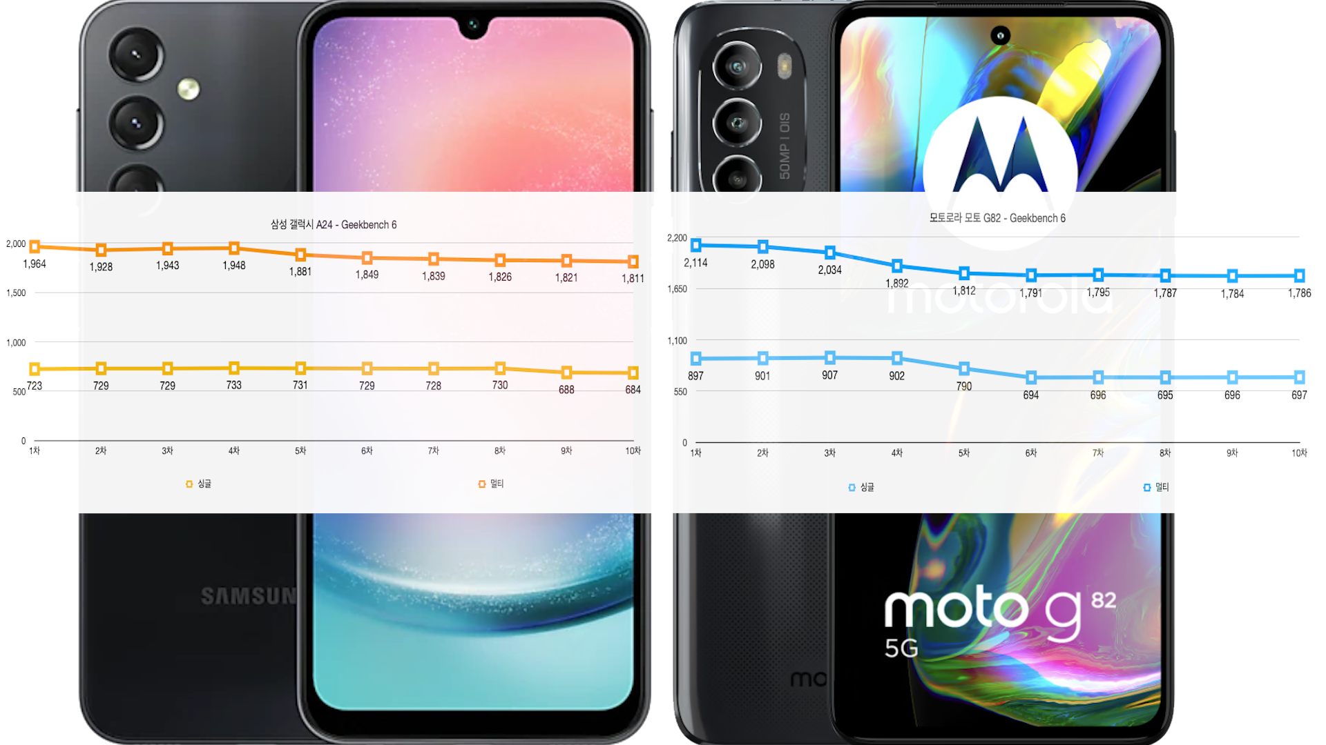 그런데 10차 테스트까지 가면 모토 G82 스로틀링이 걸리면서 갤럭시 A24와 별반 차이가 없어집니다.