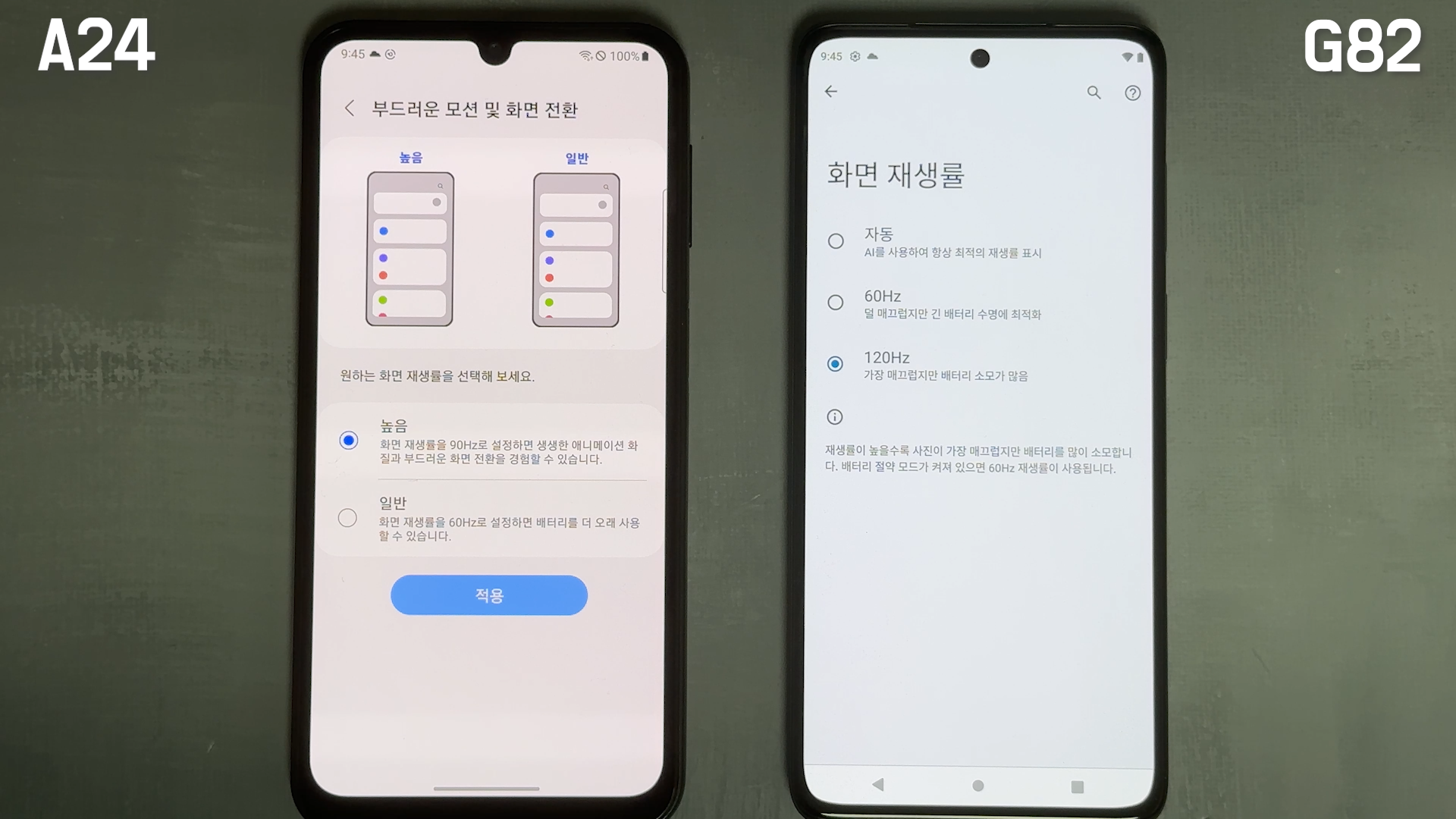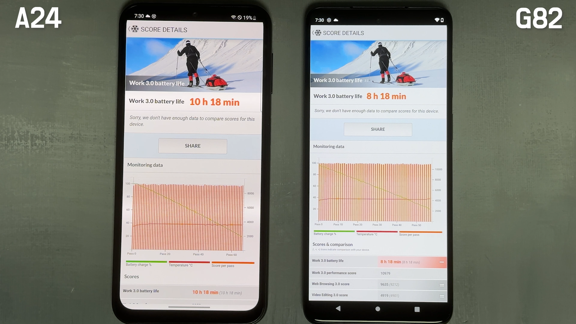 둘 다 최대 밝기 상태에서는 갤럭시 A24가 10시간 18분, 모토 G82는 8시간 18분 나왔습니다.