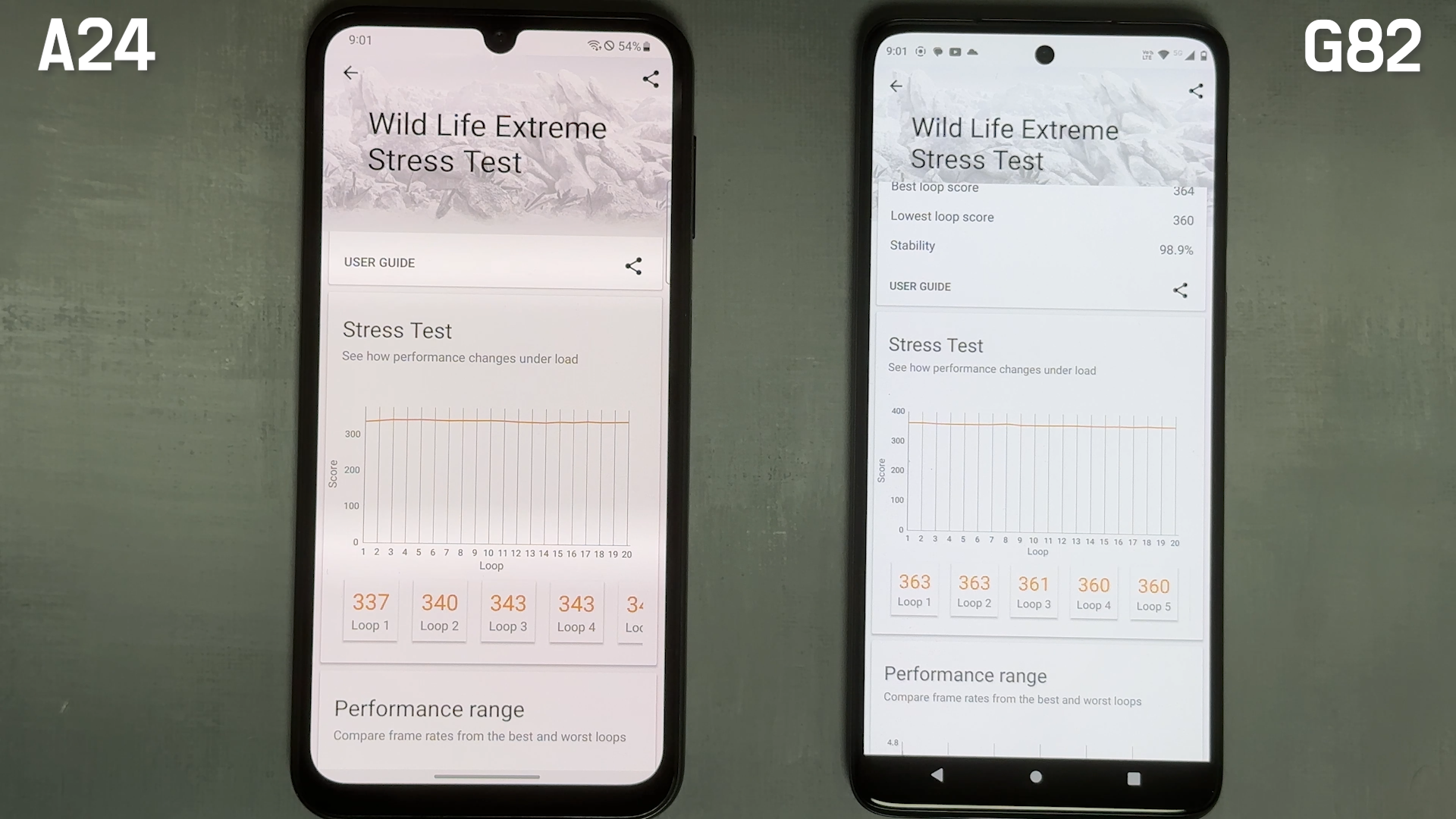Wild Life Extreme Stress Test는 갤럭시 A24는 344점, 모토 G82는 364점입니다.