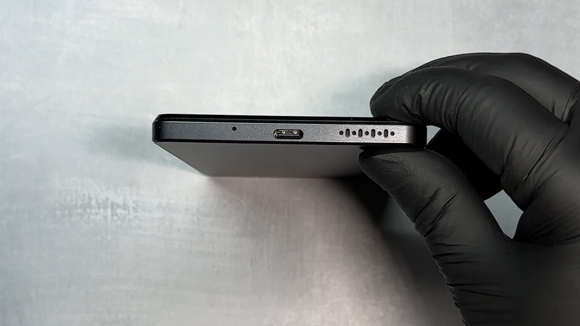 하단에는 마이크, USB-C 포트, 스피커가 있습니다.