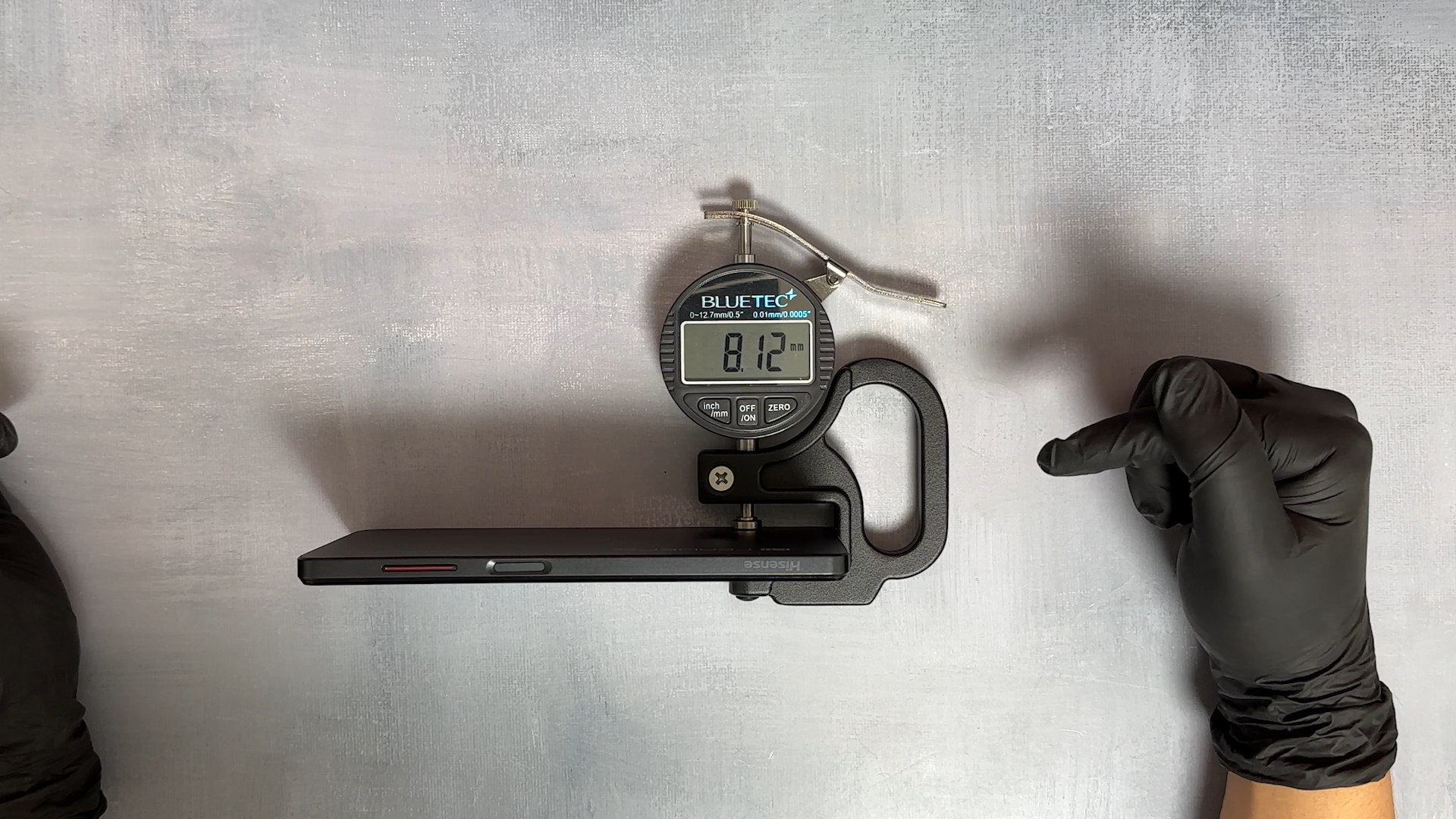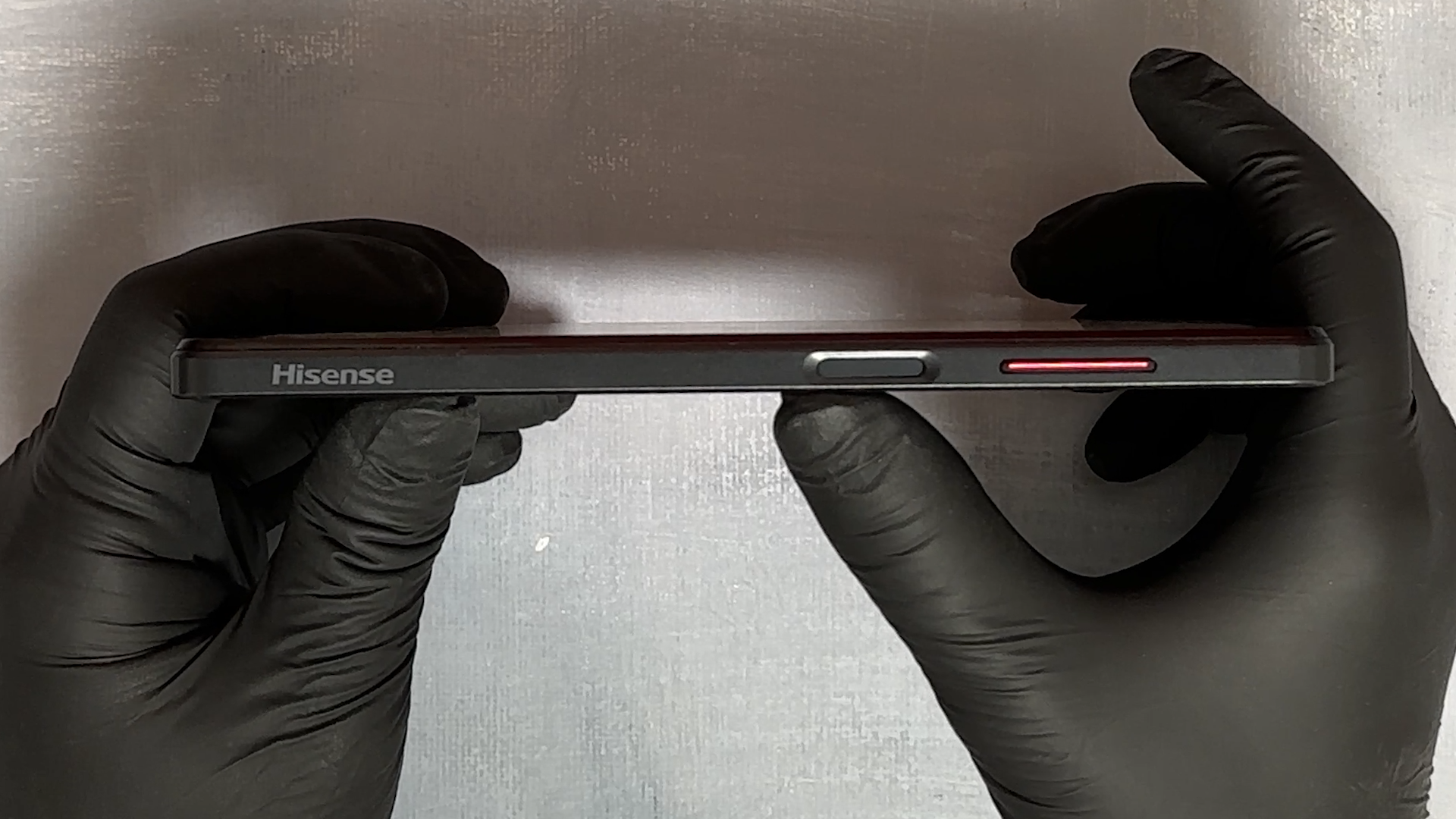 측면에 Hisense 마크가 있고 전원키는 지문 인식이 됩니다. 볼륨키는 빨간색으로 디자인 포인트를 살렸습니다.