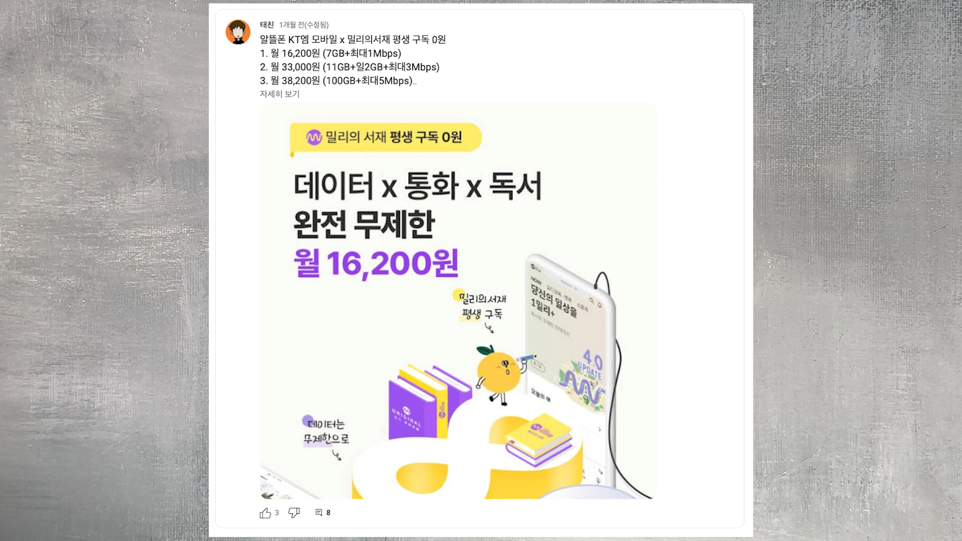 밀리의 서재 요금제로 알뜰폰 소개해 드린 적이 있잖아요