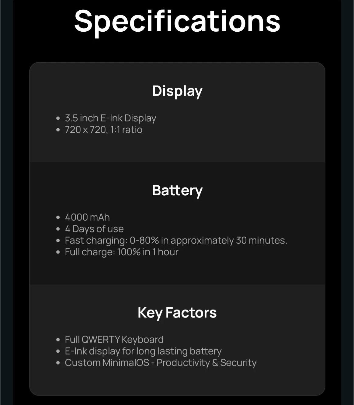 e잉크 디스플레이의 장점은 소비 전력이 적어서, 4000mAh 배터리가 장착된 미니멀폰은 4일 동안 사용할 수 있습니다. 빠른 충전이 가능해서 30분 만에 0-80%, 1시간 만에 완전 충전이 가능하다고 합니다.