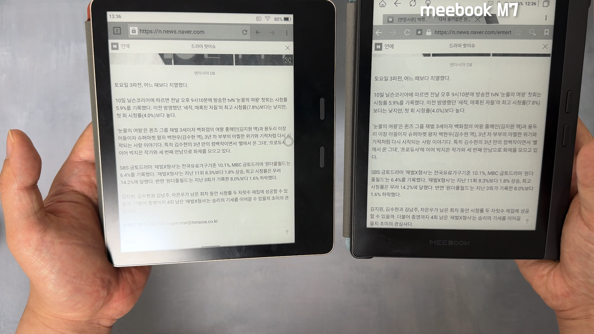 스크린은 7인치에 1680 x 1264 해상도, 300 PPI로 고해상도 제품이고 e잉크 Carta 1200 디스플레이를 사용하고 있습니다. 보위에 Meebook M7 6.8인치 제품과 비교했을 때 둘 다 고해상도 제품이라서 빠른 모드에서도 괜찮은 가독성을 보여줍니다.