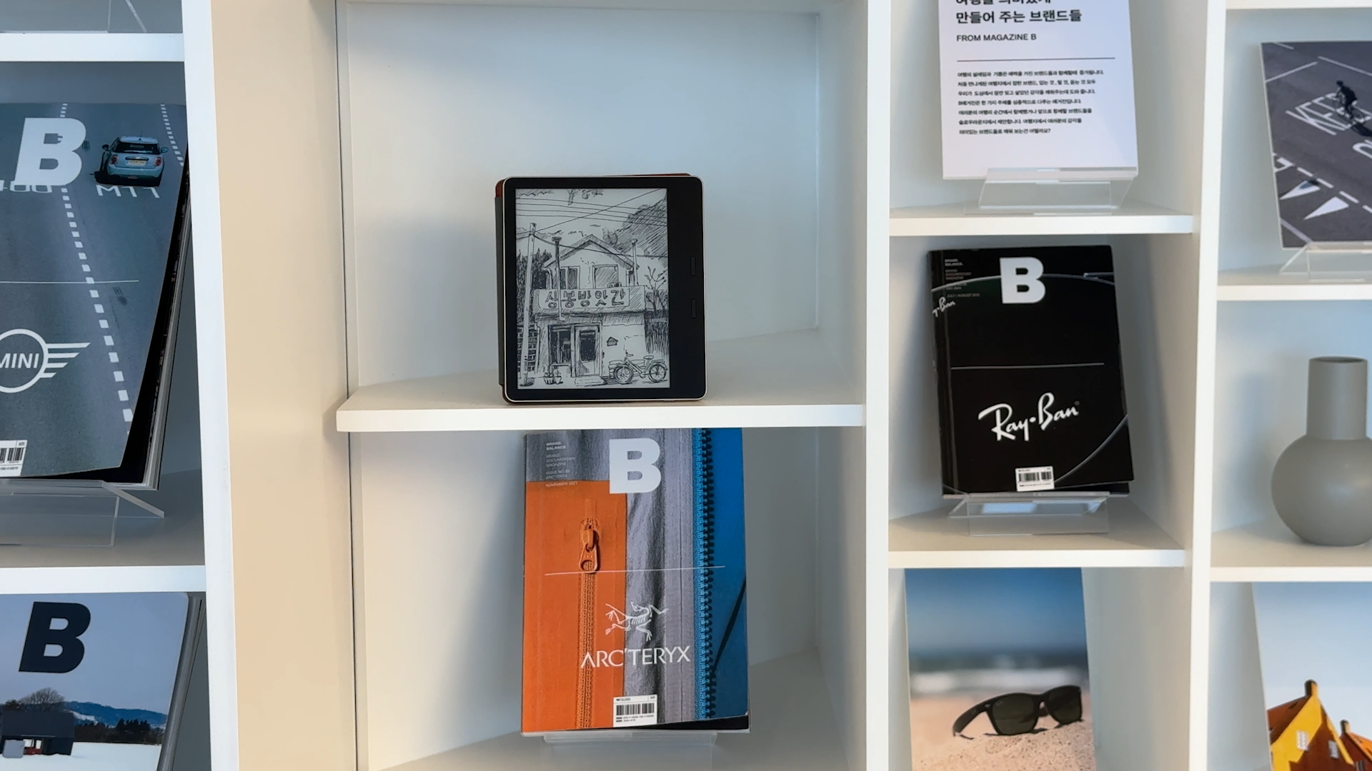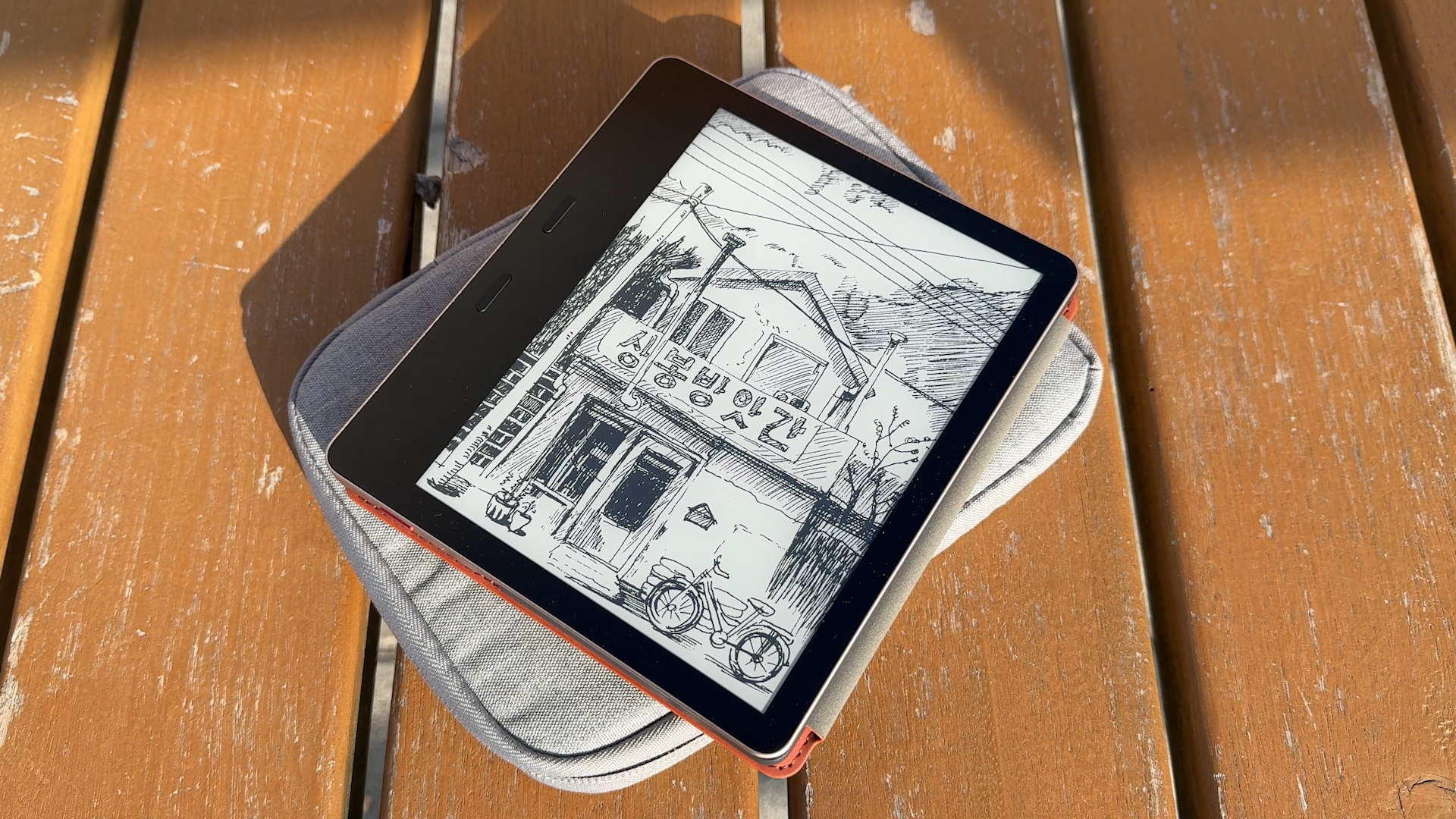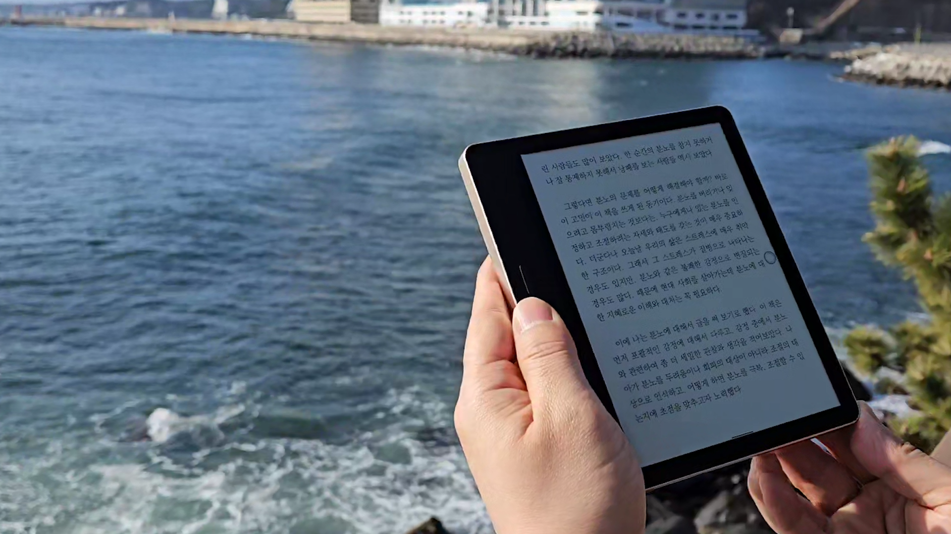 야외에서 e잉크 패널 밝기 보이시나요? 스마트폰이나 태블릿에서는 느낄 수 없는 부분인데요 야외에서는 책과 구분하기 힘들정도로 종이 같은 느낌을 받을 수 있습니다.
