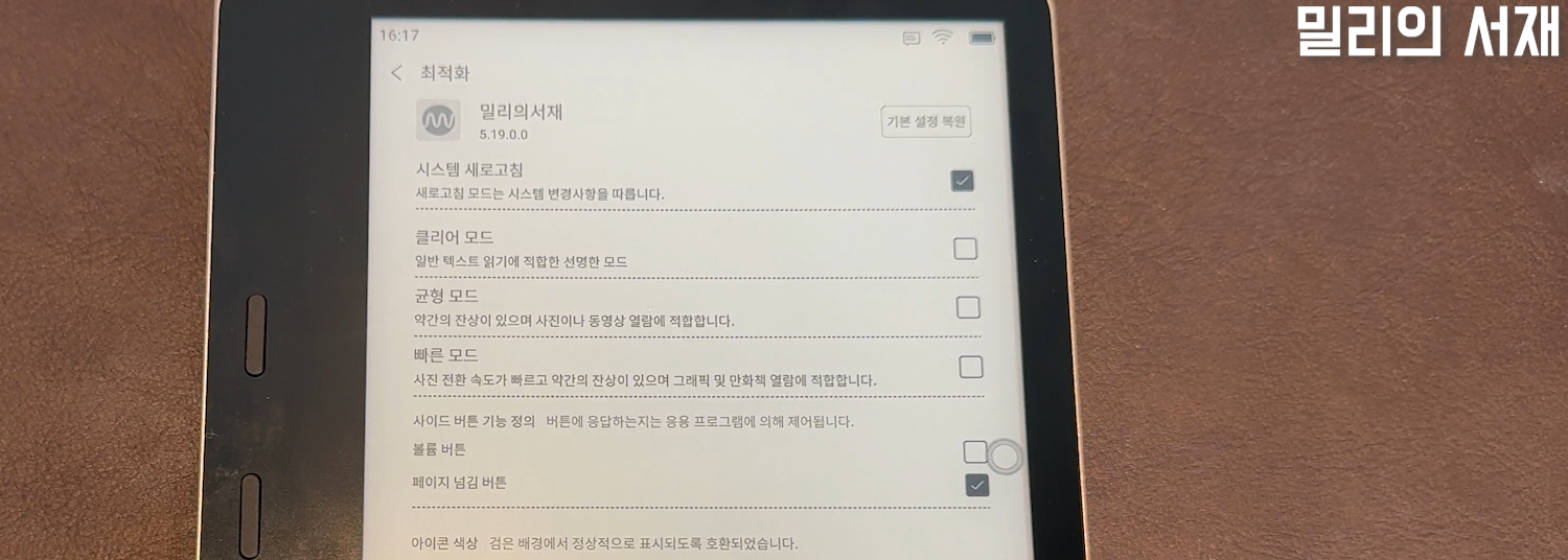 물리 버튼 동작은 밀리의 서재 앱은 물리키를 누르면 음량 조정이 되면서 페이지를 넘길 수 없습니다. 밀리의 서재를 몇 초간 누르면