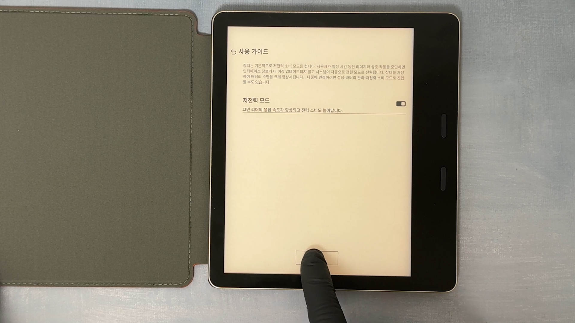 초기 설정은 다른 e북 Reader 제품과 차이는 없는데요 이 제품은 저전력 모드가 있습니다. 배터리를 더 오래 쓰고 싶을 때 사용하는 기능입니다.