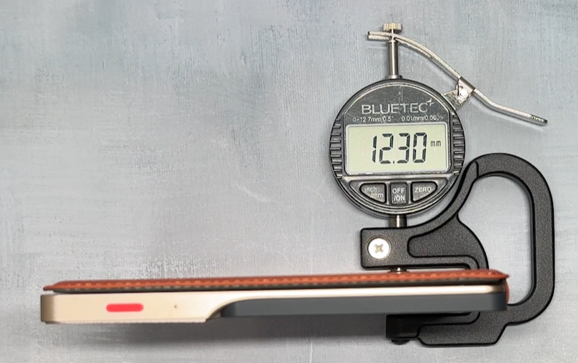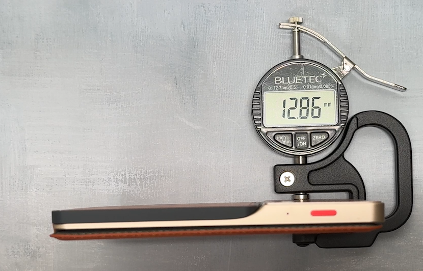 케이스 결합하고 가장 두꺼운 부분은 12.8mm, 얇은 부분이 12.3mm 나옵니다.