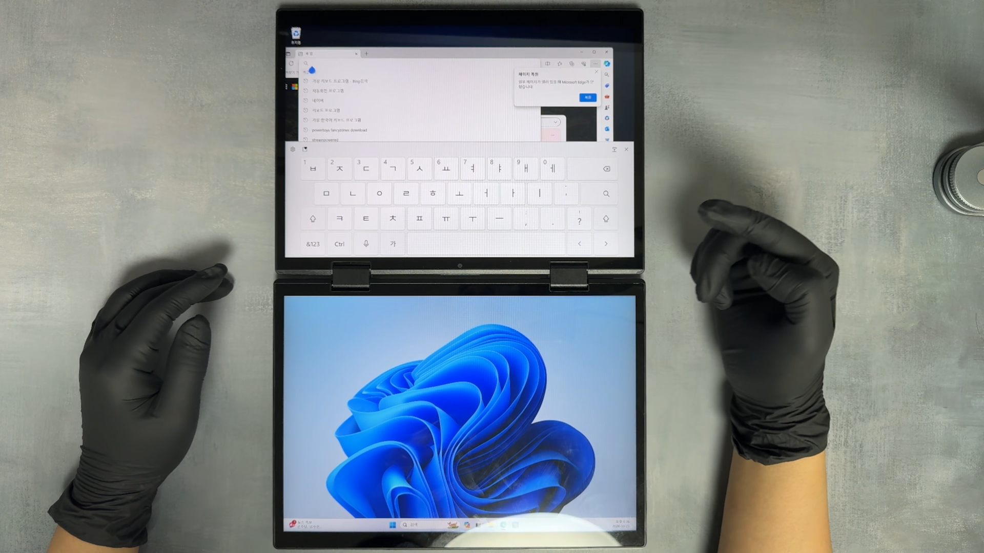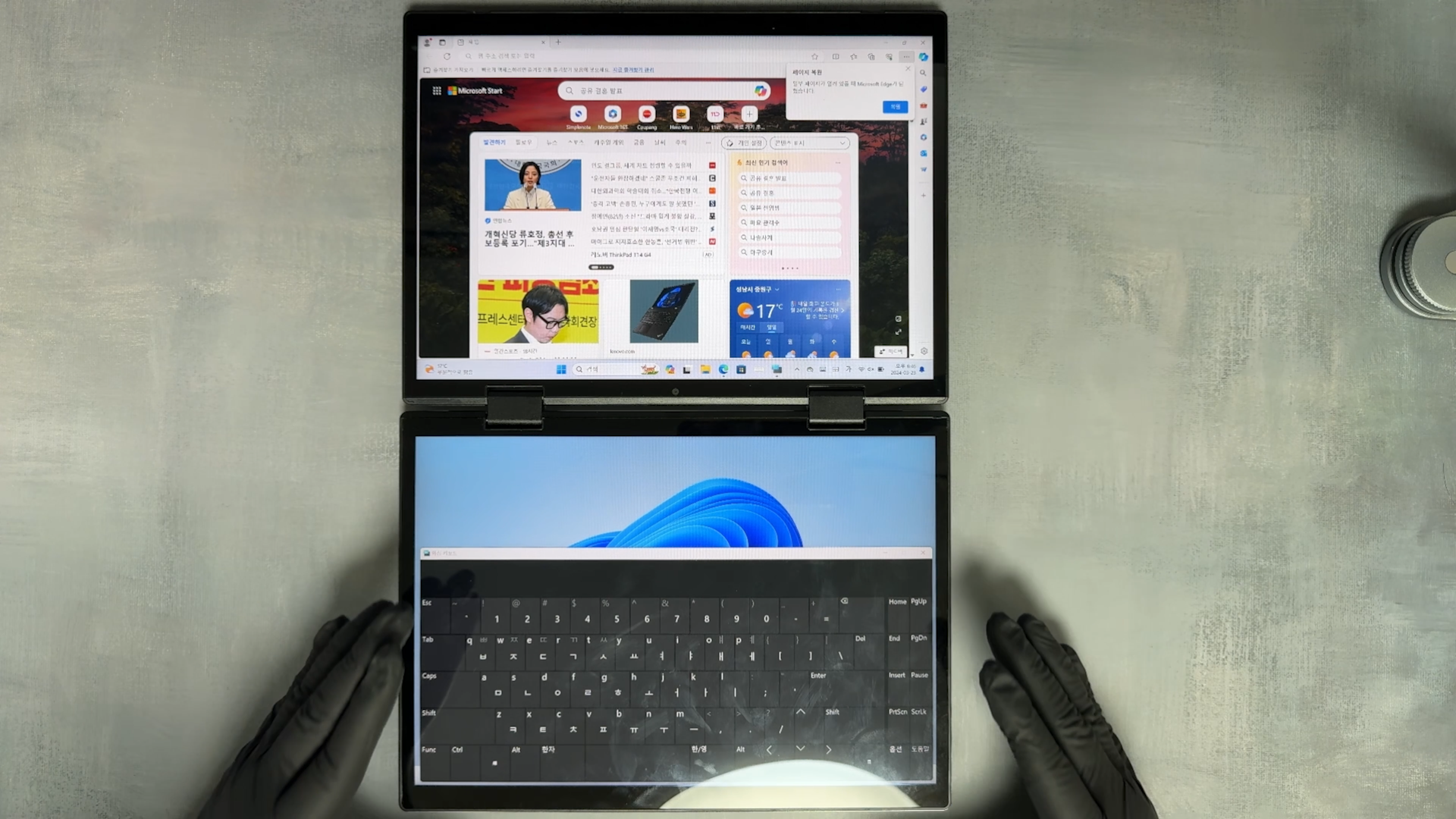 완전히 접어서 사용하게 되면 아래쪽 화면이 꺼지는 기능은 있습니다. 그래서 한쪽 화면만 태블릿처럼 사용이 가능합니다. 디자인도 나쁘지 않네요 언박싱 첫 느낌은 괜찮습니다.