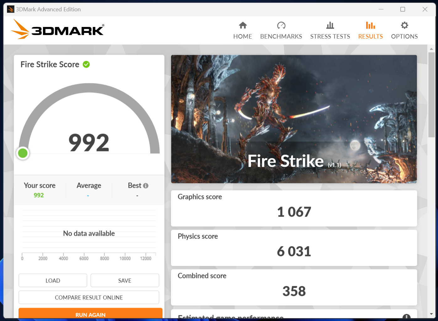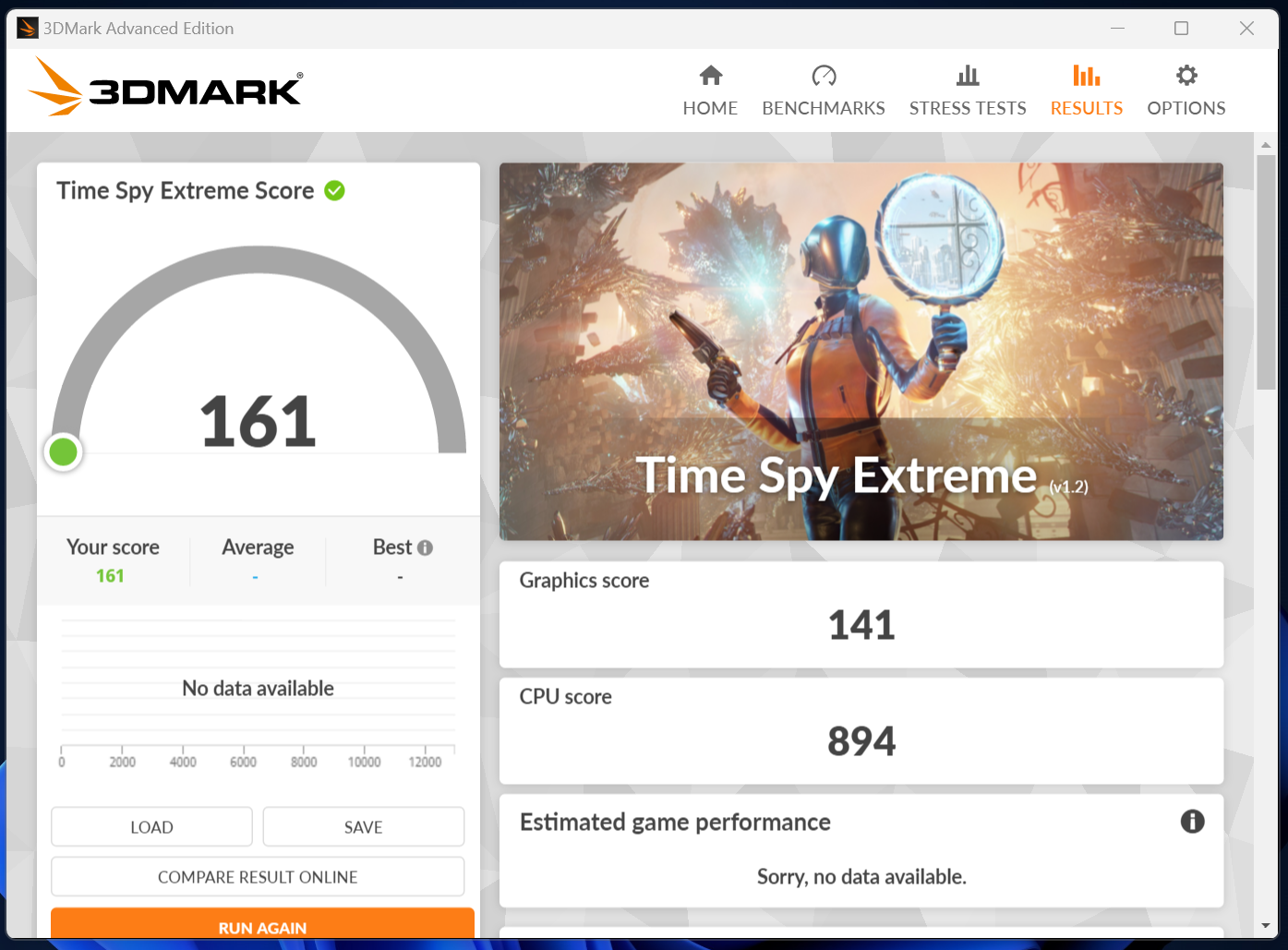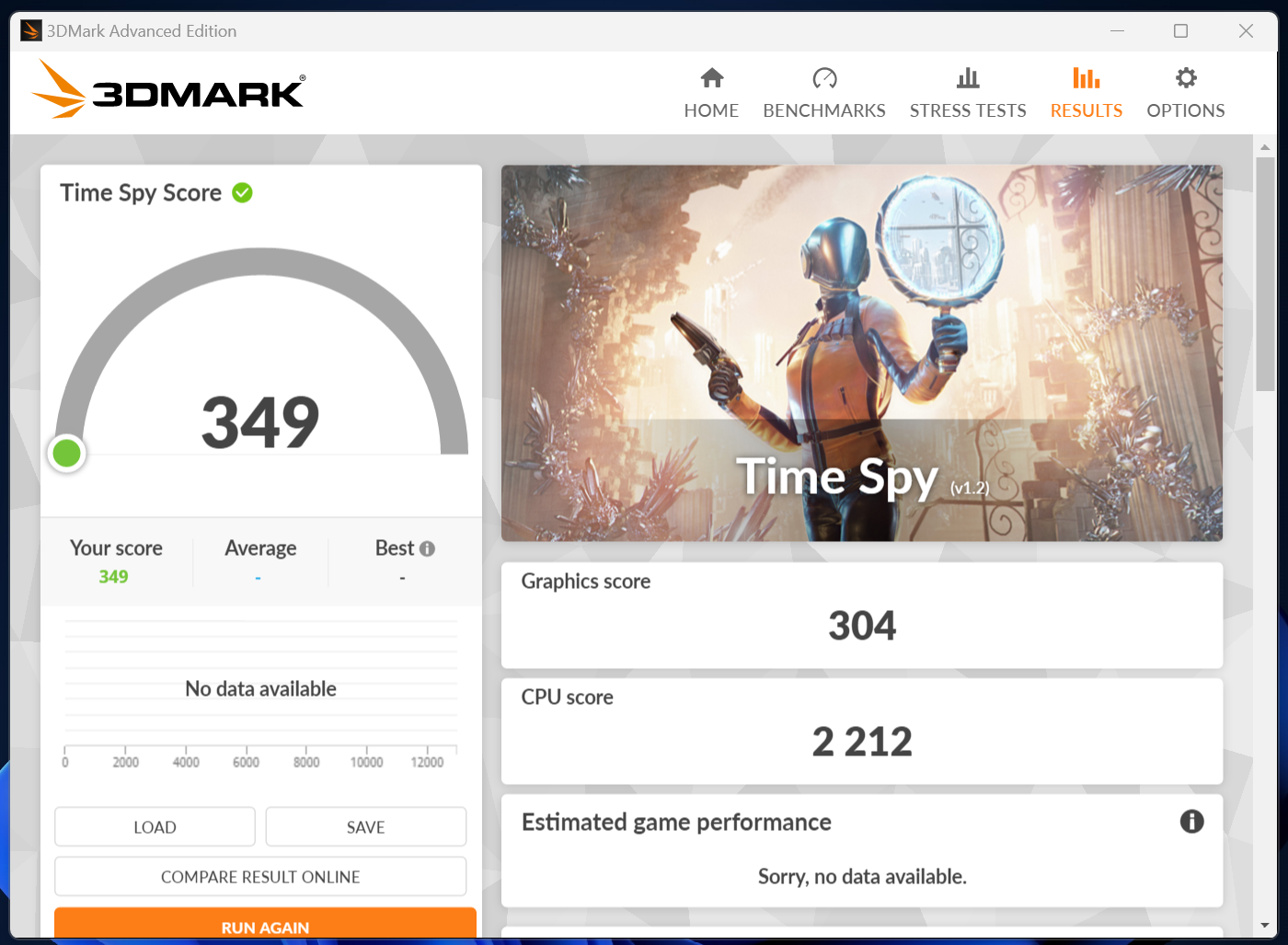 3DMark 그래픽 성능 측정에서 Time Spy 349점, Time Spy Extreme 161점