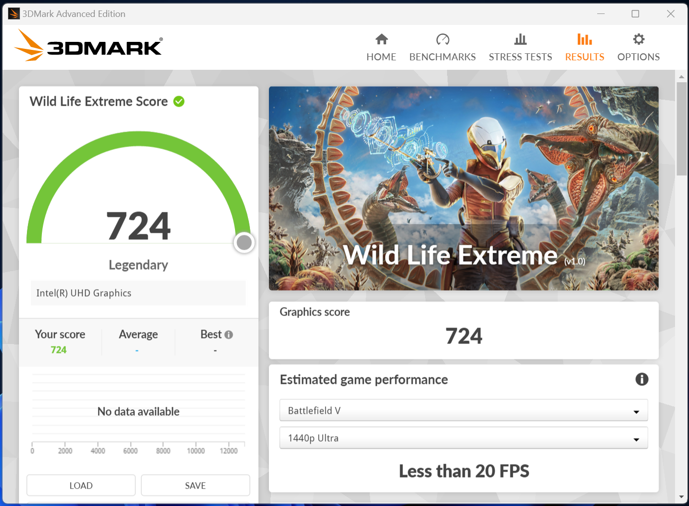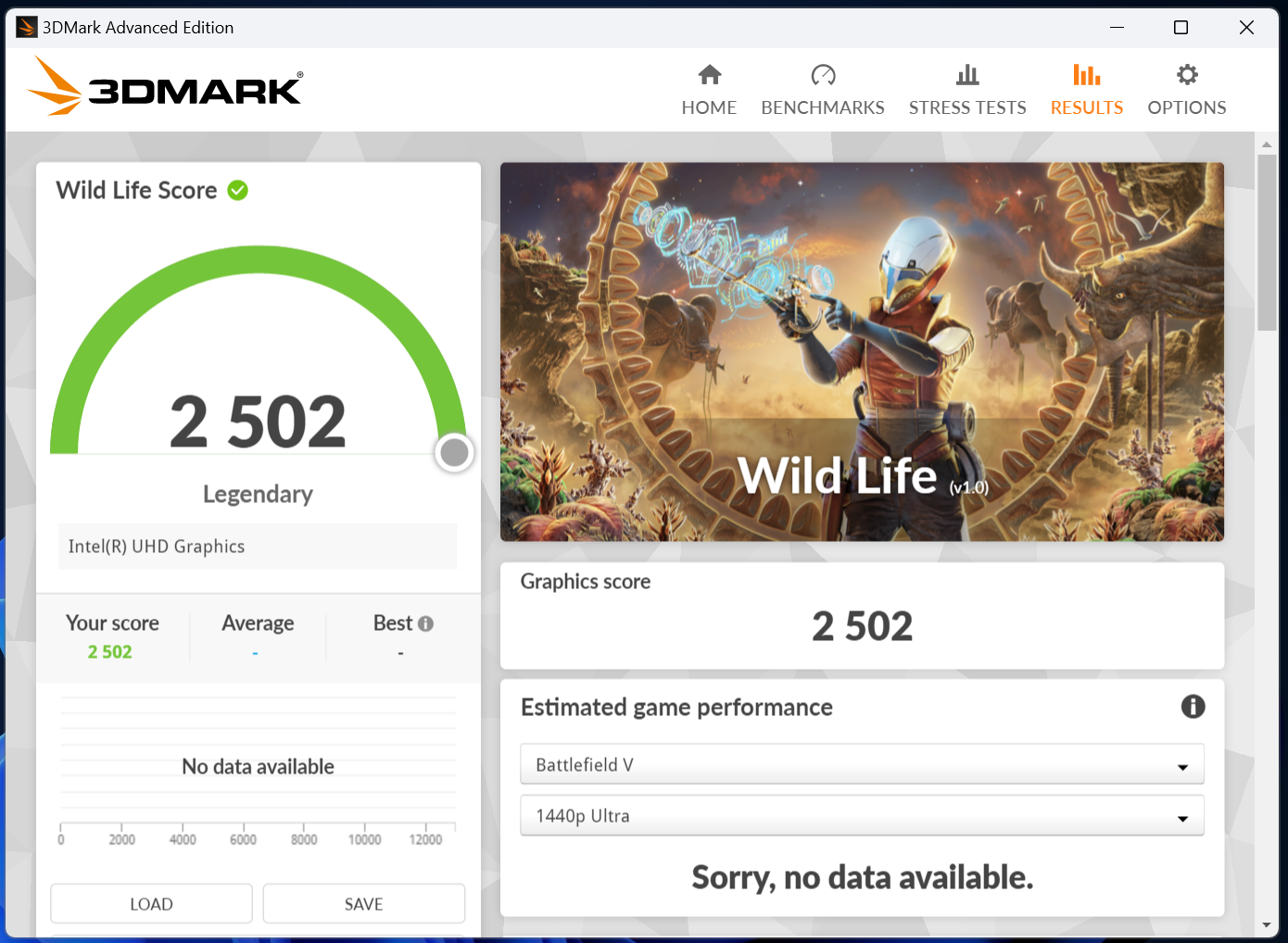 Wild Life 2,502점, Wild Life Extreme Score는 724점 나왔습니다.