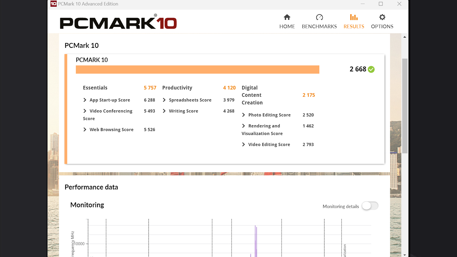 PC 실사용 환경에서 성능 체크하는 PCMARK 10에서는 2668점 나왔습니다. 요가북 C930는 2332점 나옵니다.