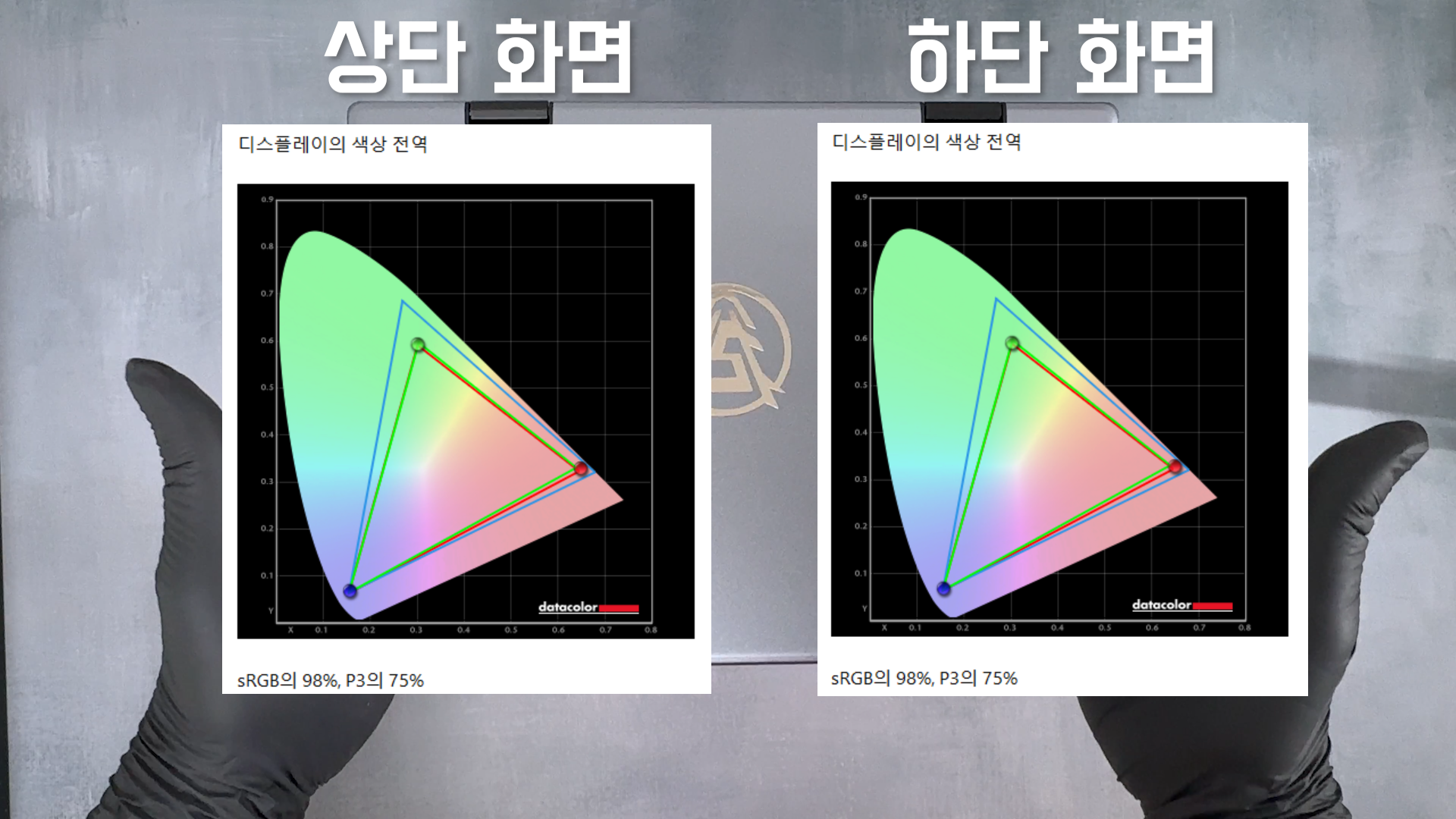 정보가 거의 없는 제품이라서 직접 액정 디스플레이 테스트를 진행해 봤습니다. 상단 하단 디스플레이 모두 sRGB 98%, P3 75% 동일하게 측정되었습니다.