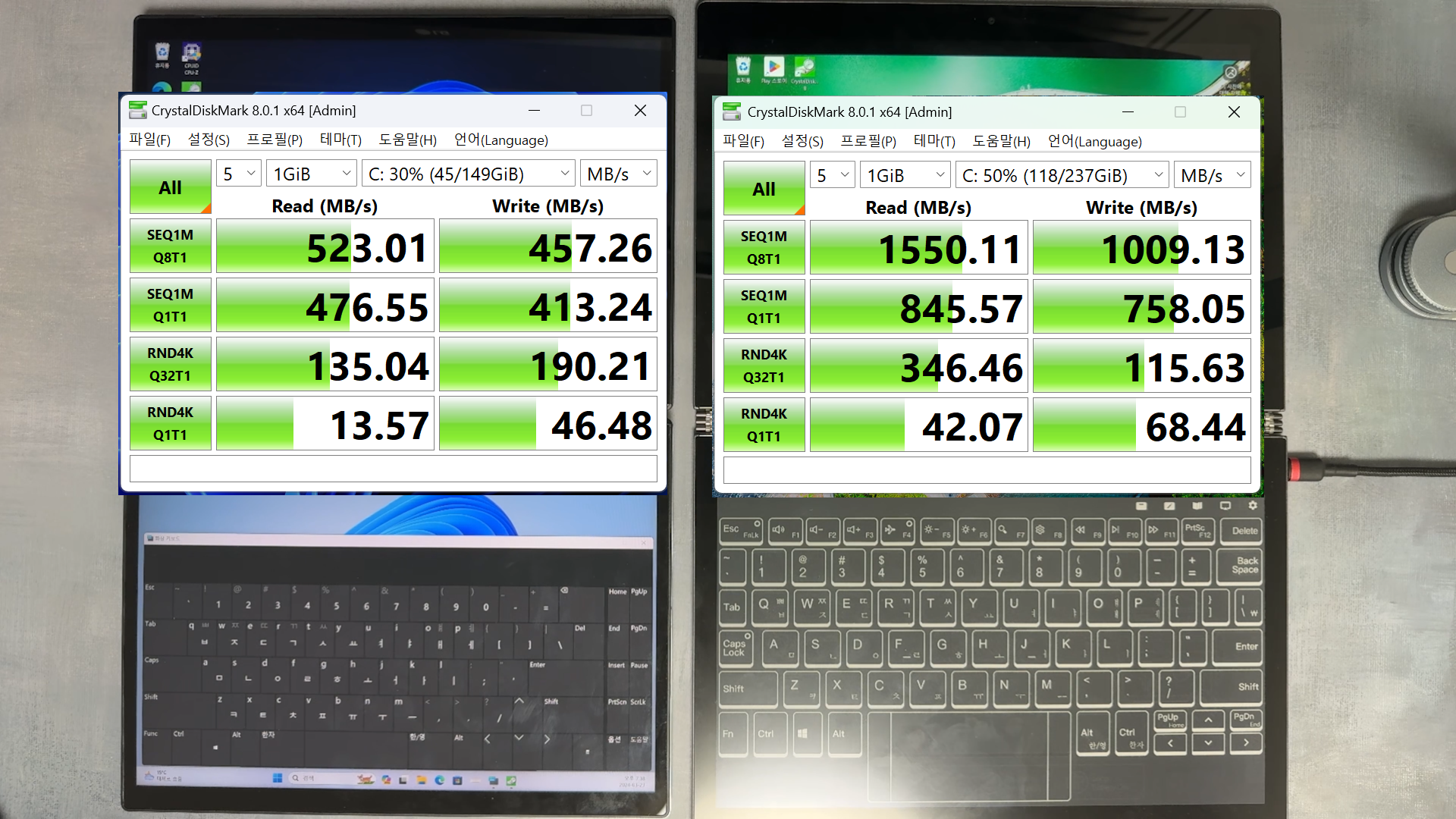 Crystal DiskMark는 읽기 523점/쓰기 457점 나옵니다. 요가북 C930은 읽기 1550점/쓰기 1009점입니다.저가 SSD 탑재로 성능이 잘 안나오는데요 베어본 구입해서 직접 성능 좋은 SSD 제품을 넣어서 사용해도 되니까 이건 넘어갈게요