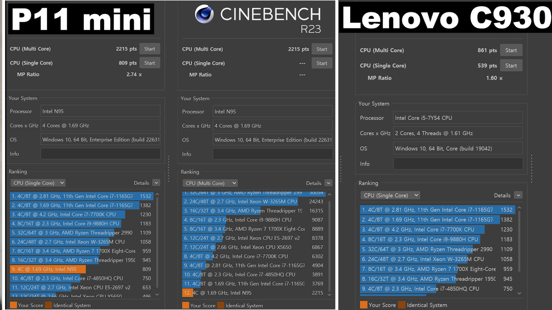 CPU 연산 성능을 확인하는 Cinebench R23에서는 싱글 809점, 멀티 2215점 나옵니다. 싱글은 i7-4850HQ 보다 높게 나왔고 멀티는 11세대 i7-1165G7 아래 등급으로 나왔는데 점수차가 많이 나서 한참 아래 등급일 것 같네요 C930은 싱글 539점, 멀티 861점 나옵니다.