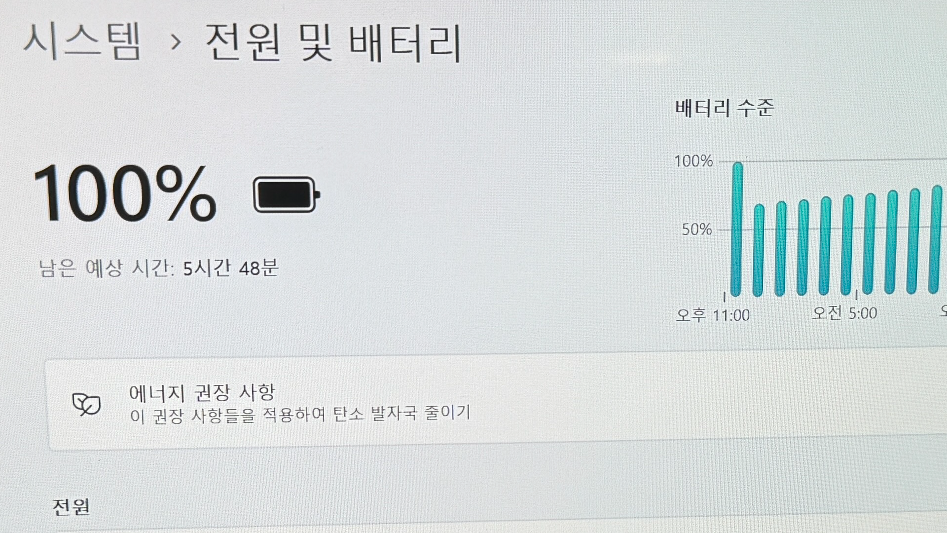 스펙시트를 보면 배터리 7.7V 3200mAh 표기되어 있습니다. 실사용 3시간이 안되는 짧은 배터리 타임이 아쉬웠는데요 밝기 30%에 최고의 전원 효율성 모드로 사용하면 5시간 48분 남았다고 나옵니다. 밝기는 30%는 저녁 실내에서는 충분한 밝기입니다. 배터리 모드에서는 이렇게 사용하고 성능 모드로 사용할 때는 충전기는 상시 지니고 다녀야 되겠습니다.