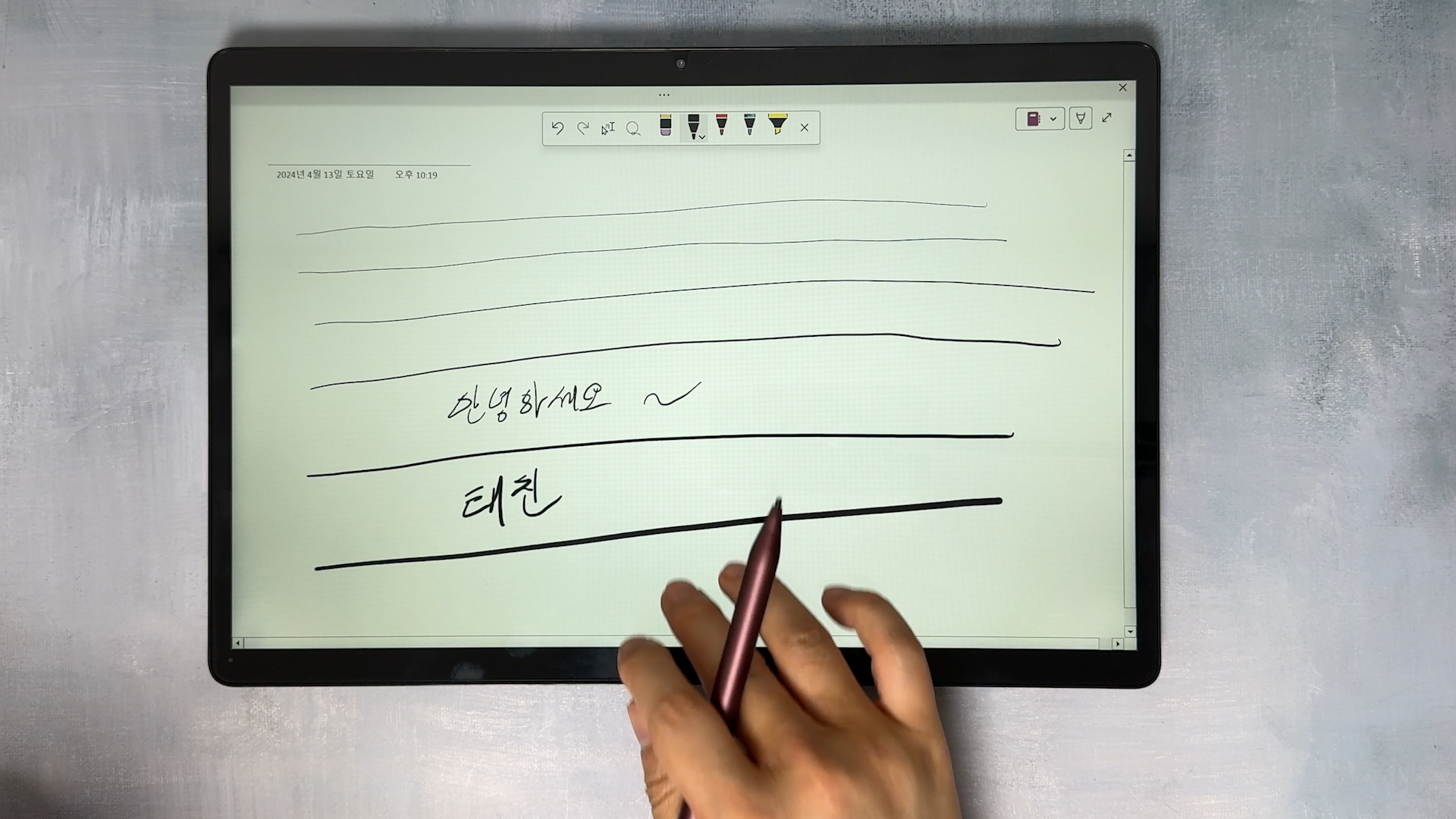 펜은 MPP 1.5, MPP 2.0 엑티브 스타일러스펜 지원합니다. 아이뮤즈 제품을 구입해도 되고, 시중에 MPP 펜을 구입해도 됩니다. 와콤 펜이나 삼성 S펜처럼 좋은 필기감을 제공하지는 않지만 팜리젝션을 지원해서 간단한 기록은 충분히 가능할 것 같습니다.